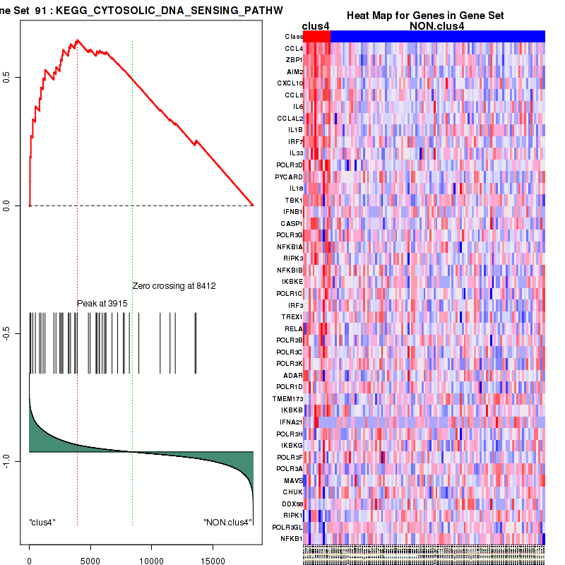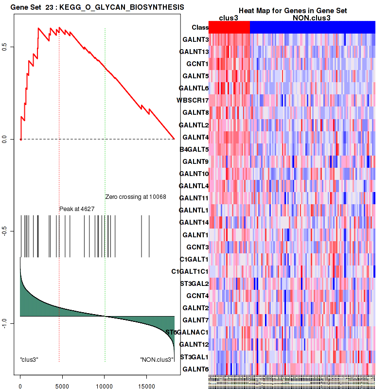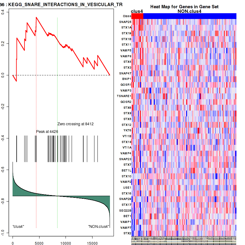 Table S40. Get Full Table This table shows a Running Enrichment Score (RES) of each gene in this pathway, that is, the enrichment score at this point in the ranked list of genes. All genes are ranked by Signal-to-Noise (S2N), a measure of similarity as default and are used to obtain ES matrix of all genes. In this way, GSEA tool uses expression pattern of not only overlapped genes but also not-overlapped genes to produce ES matrix.
