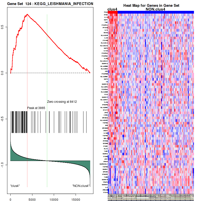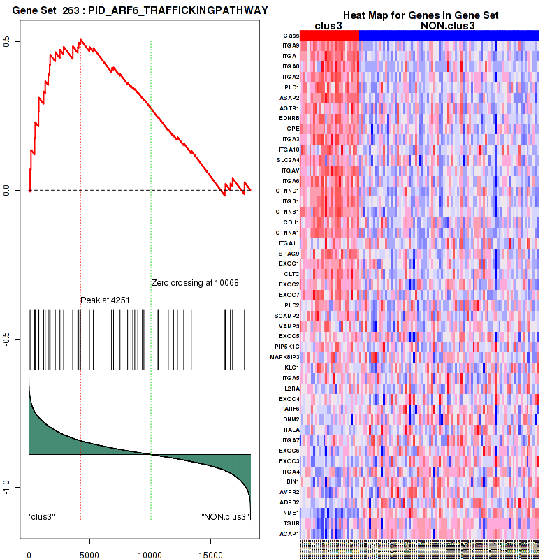 For the expression subtypes of 18301 genes in 121 samples, GSEA found enriched gene sets in each cluster using 120 gene sets in MSigDB canonical pathways. Top enriched gene sets are listed as below.