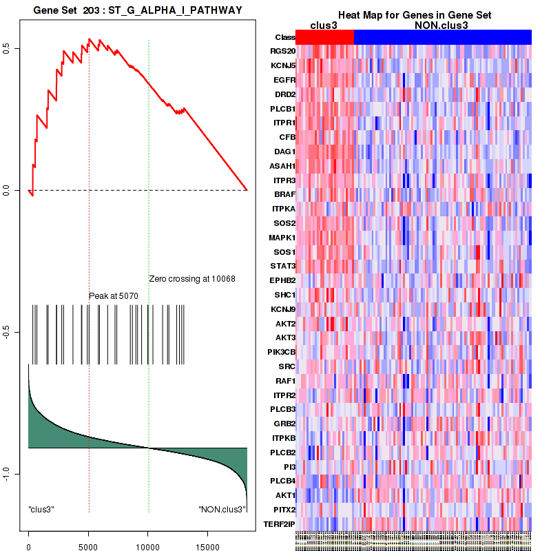 For the Gene Set Enrichment Analysis (GSEA), Broad GSEA-P-R.1.0 version is used with class2: canonical pathways geneses from MSigDB. Further details about statistics are available inThe Broad GSEA website.