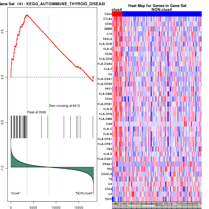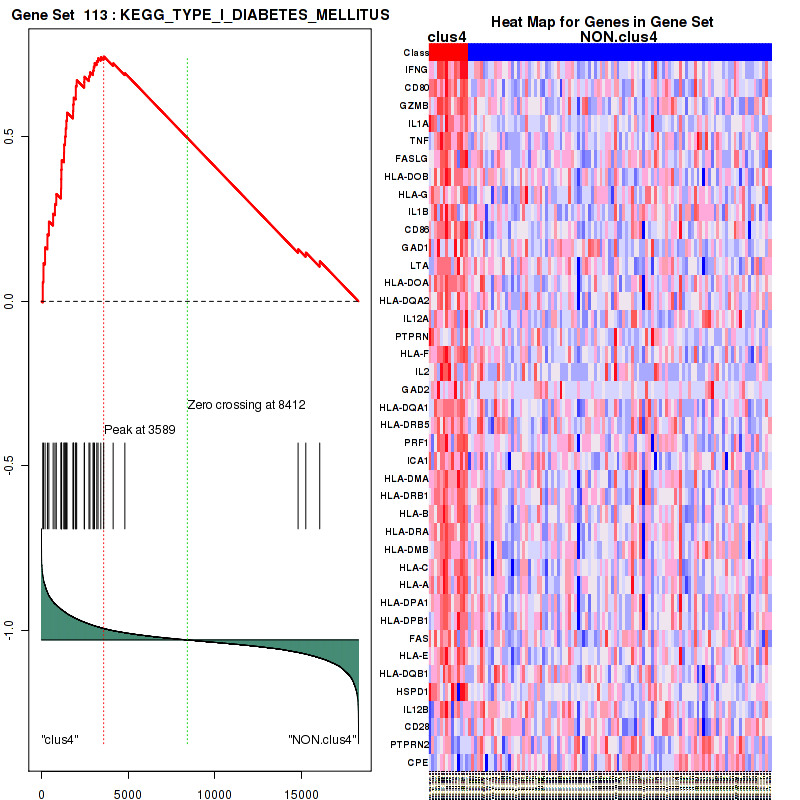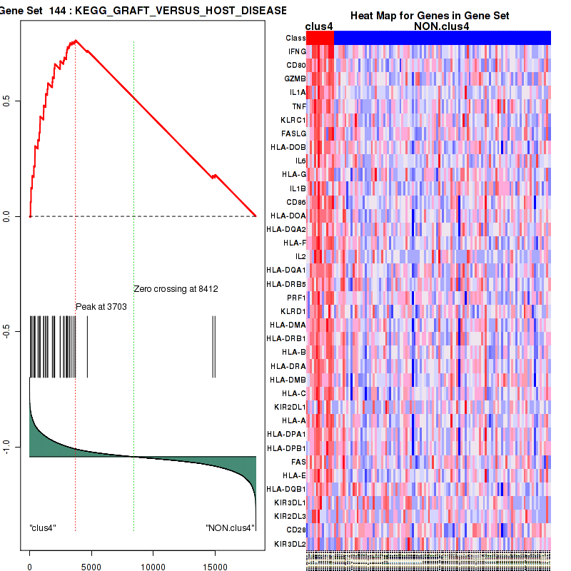 Figure S77. Get High-res Image This plot shows mRNAseq_cNMF expression data heatmap (on the left) a RunningEnrichmentScore(RES) plot (on the top right) and a Signal2Noise(S2N) plot (on the bottom right) of genes in the pathway: KEGG ALLOGRAFT REJECTION.