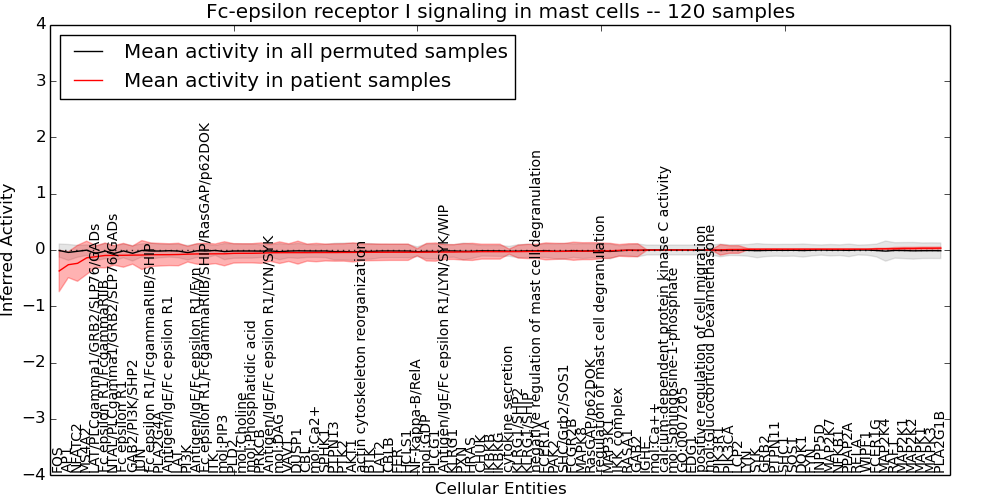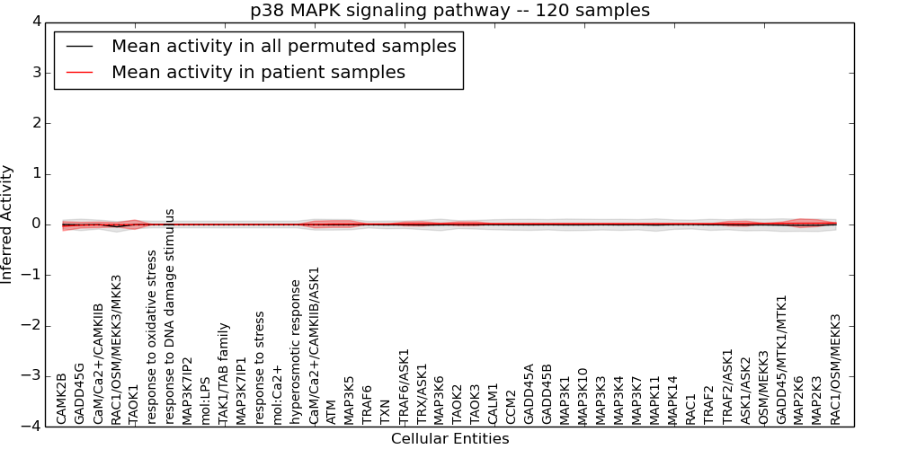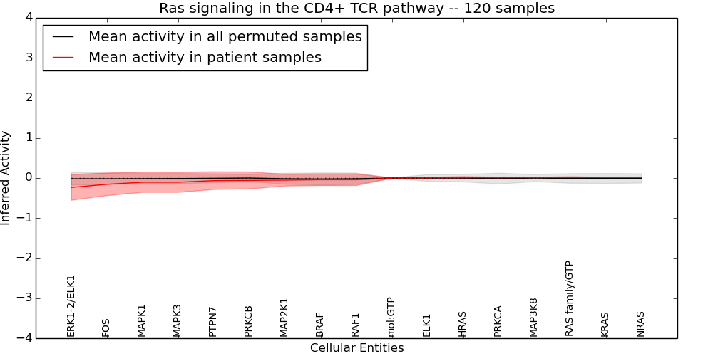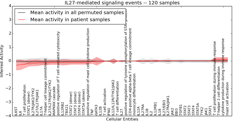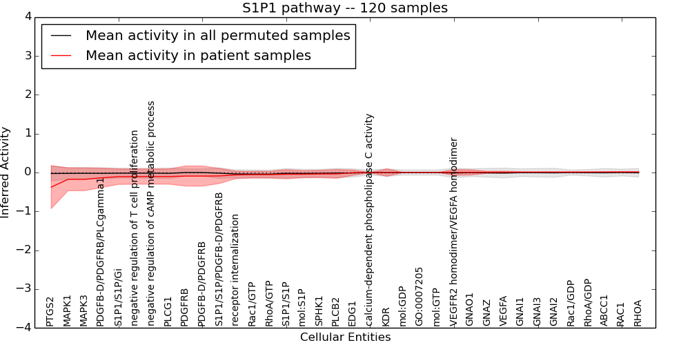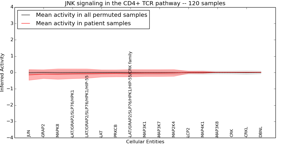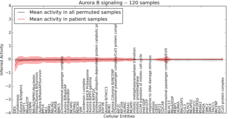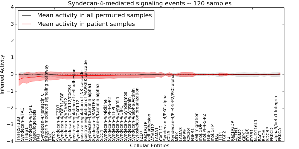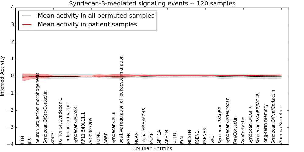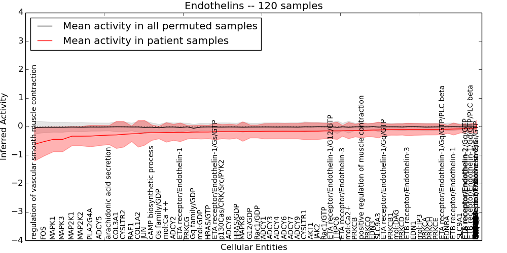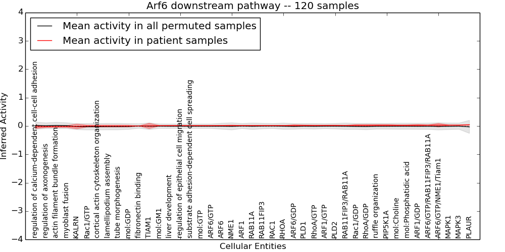 Figure S131. Get High-res Image This plot shows pathway concept perturbations across all samples against a permutation model. The concepts along the x-axis are sorted by lowest to highest mean activity for the real patient samples. Mean inferred activities are plotted along the y-axis as a colored band showing the average level and one standard deviation range. Real samples are shown in red and permuted samples in black.