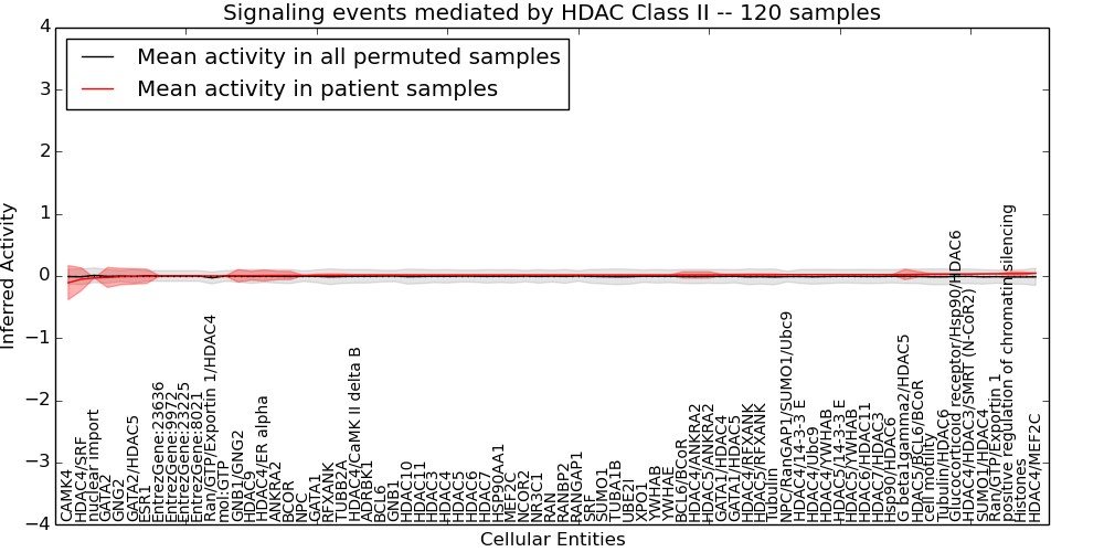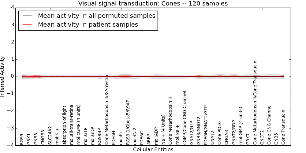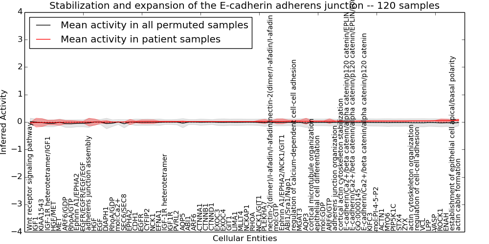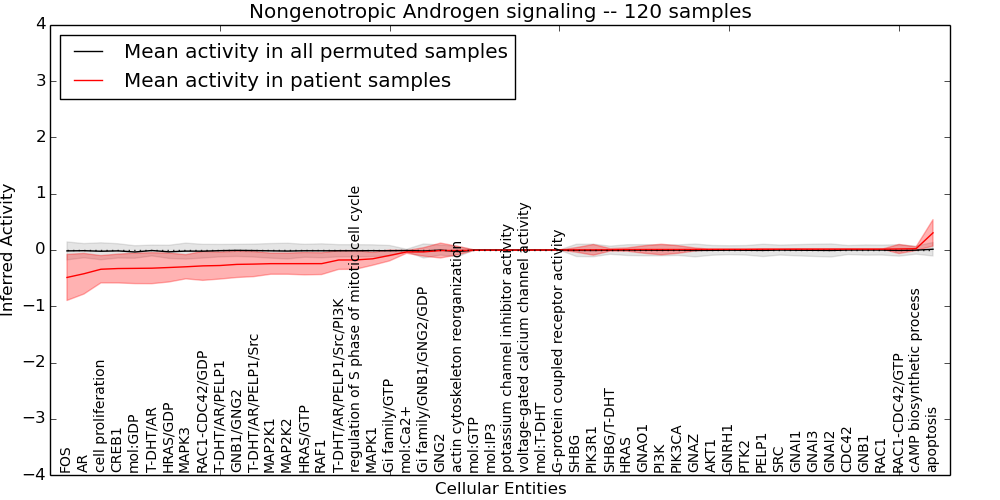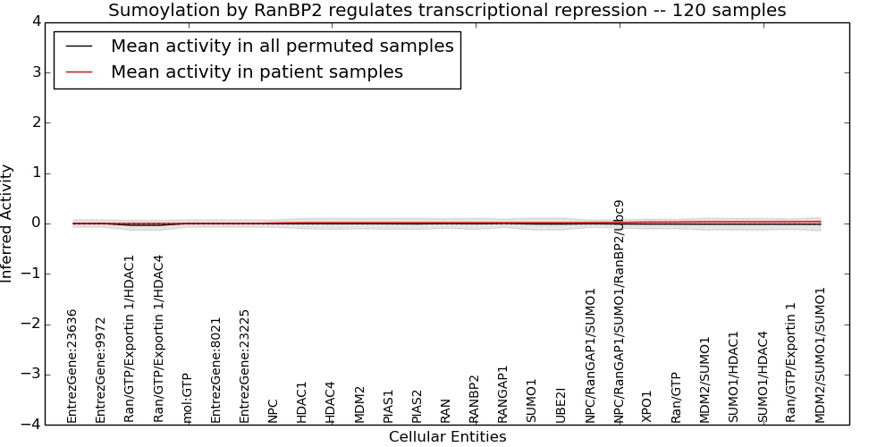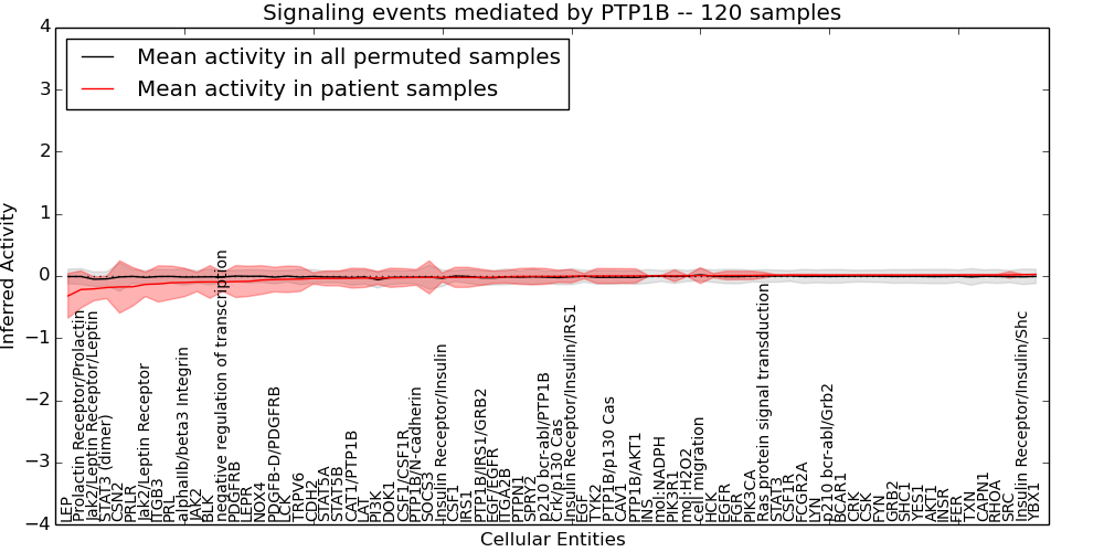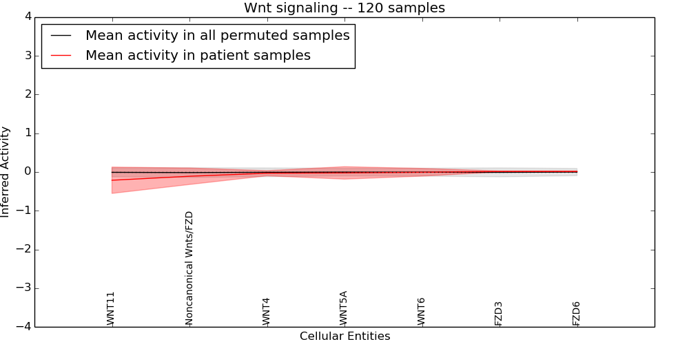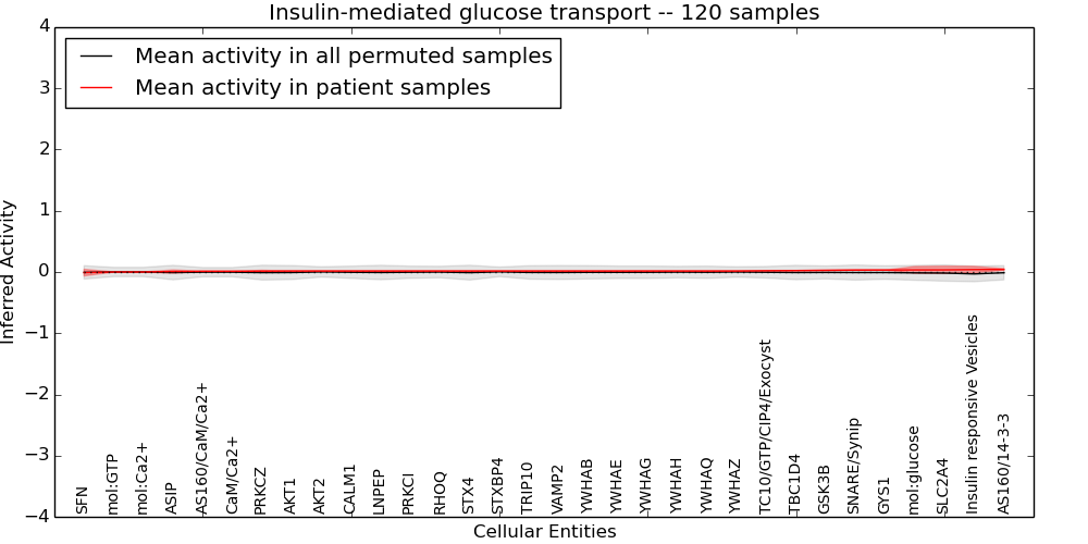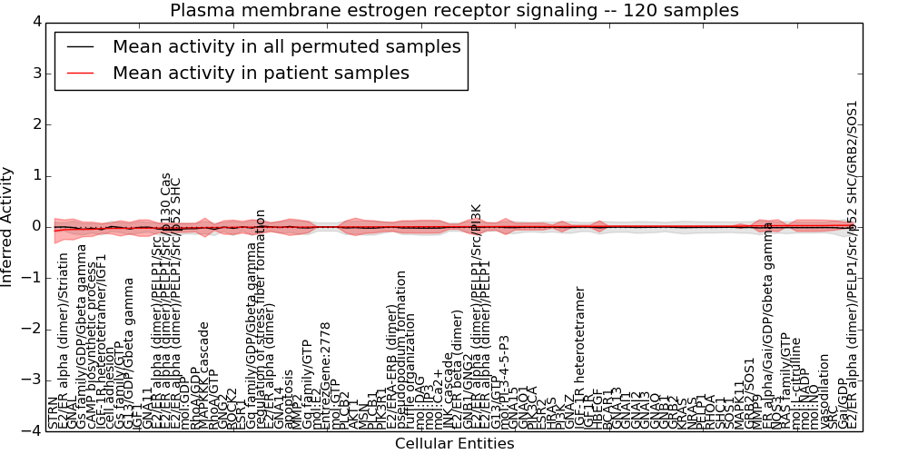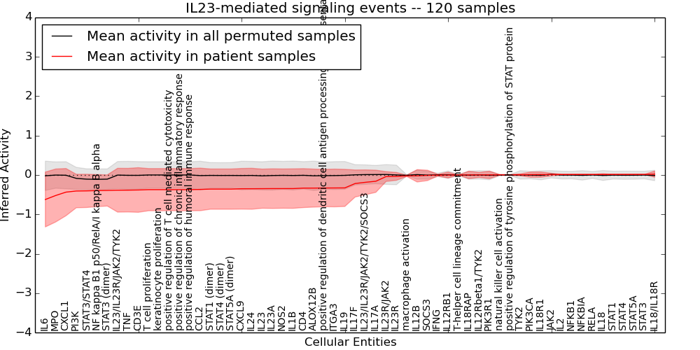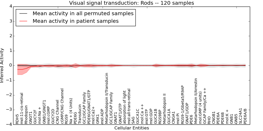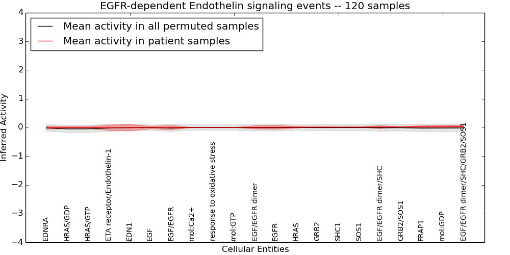Figure S131. Get High-res Image This plot shows pathway concept perturbations across all samples against a permutation model. The concepts along the x-axis are sorted by lowest to highest mean activity for the real patient samples. Mean inferred activities are plotted along the y-axis as a colored band showing the average level and one standard deviation range. Real samples are shown in red and permuted samples in black.