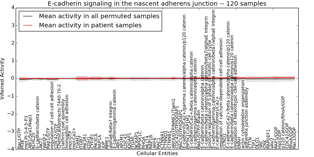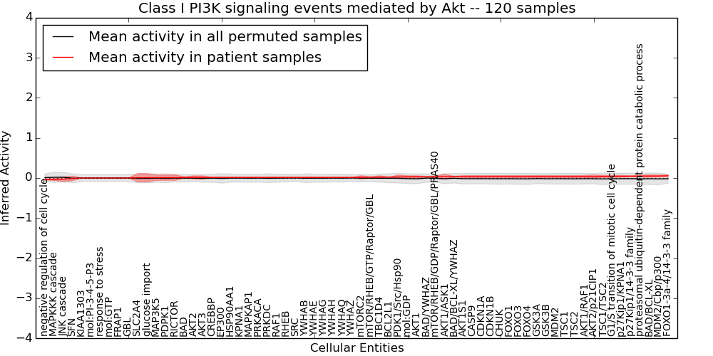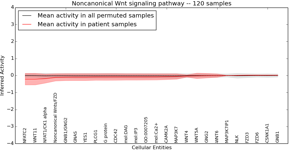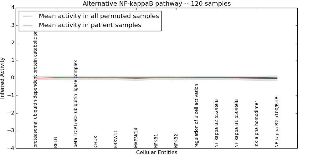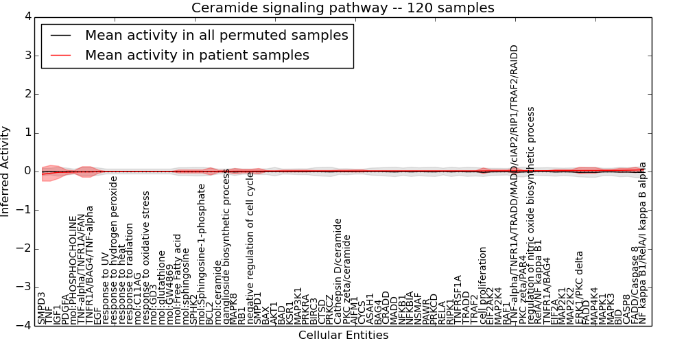 Figure S130. Get High-res Image This plot shows pathway concept perturbations across all samples against a permutation model. The concepts along the x-axis are sorted by lowest to highest mean activity for the real patient samples. Mean inferred activities are plotted along the y-axis as a colored band showing the average level and one standard deviation range. Real samples are shown in red and permuted samples in black.