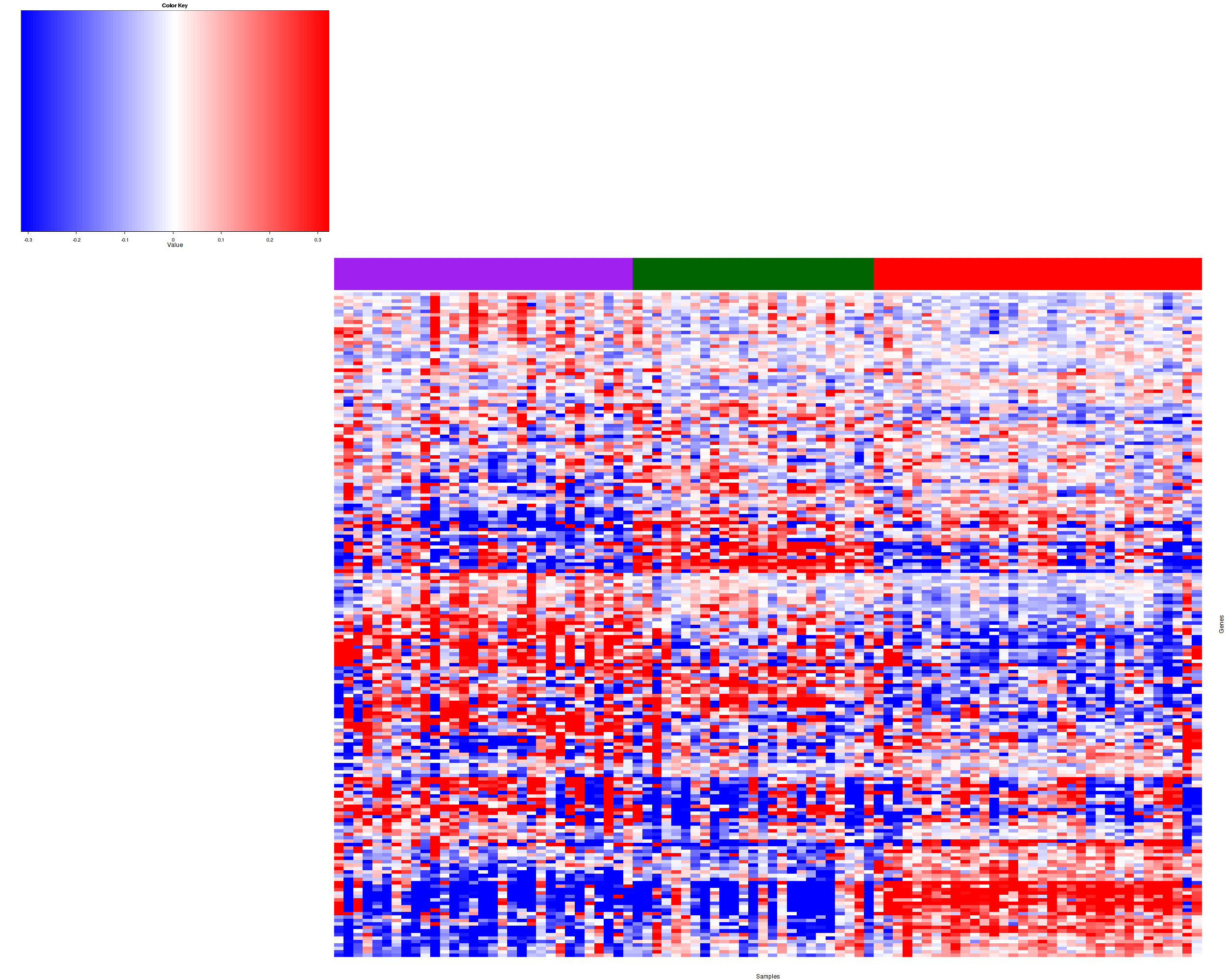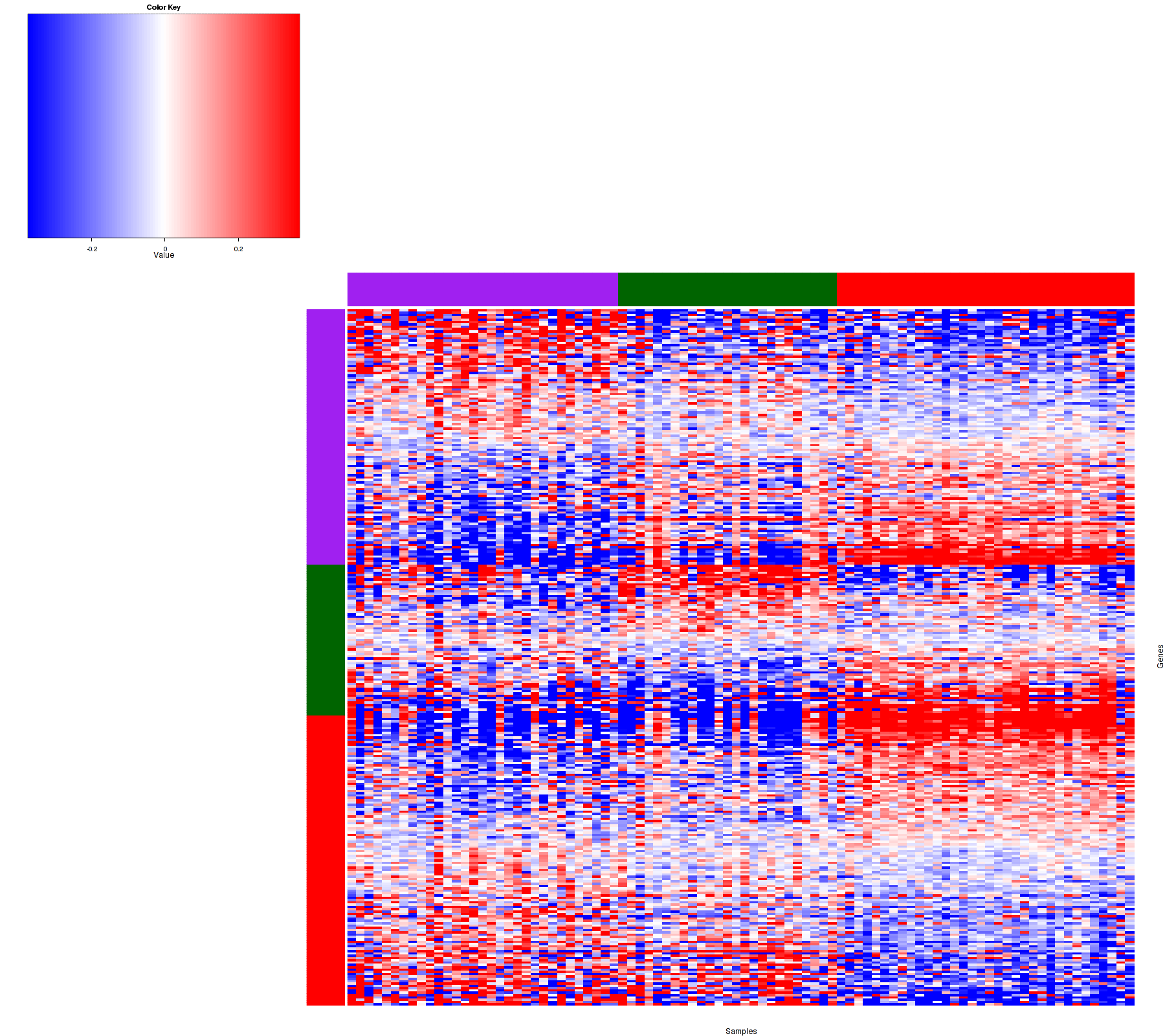 Figure 1. Get High-res Image Samples were separated into 3 clusters. Shown are 90 samples and 300 marker proteins. The color bar of the row indicates the marker proteins for the corresponding cluster.