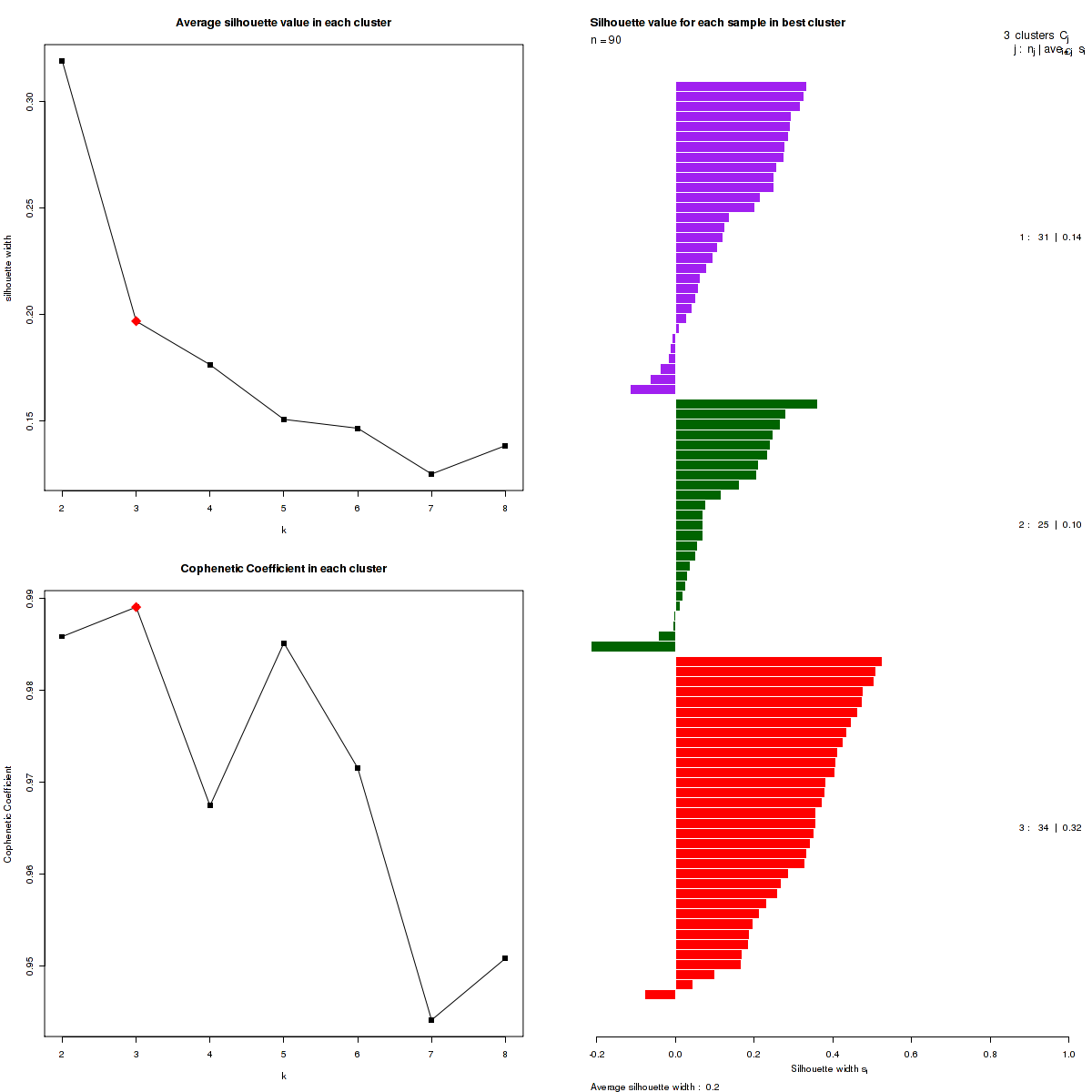 Figure 3. Get High-res Image The silhouette width was calculated for each sample and each value of k. The left upper panel shows the average silhouette width across all samples for each tested k (left upper panel). The left lower panel shows the Cophenetic Correlation Coefficients for each tested k. The right panel shows assignments of clusters to samples and the silhouette width of each sample for the most robust clustering.
