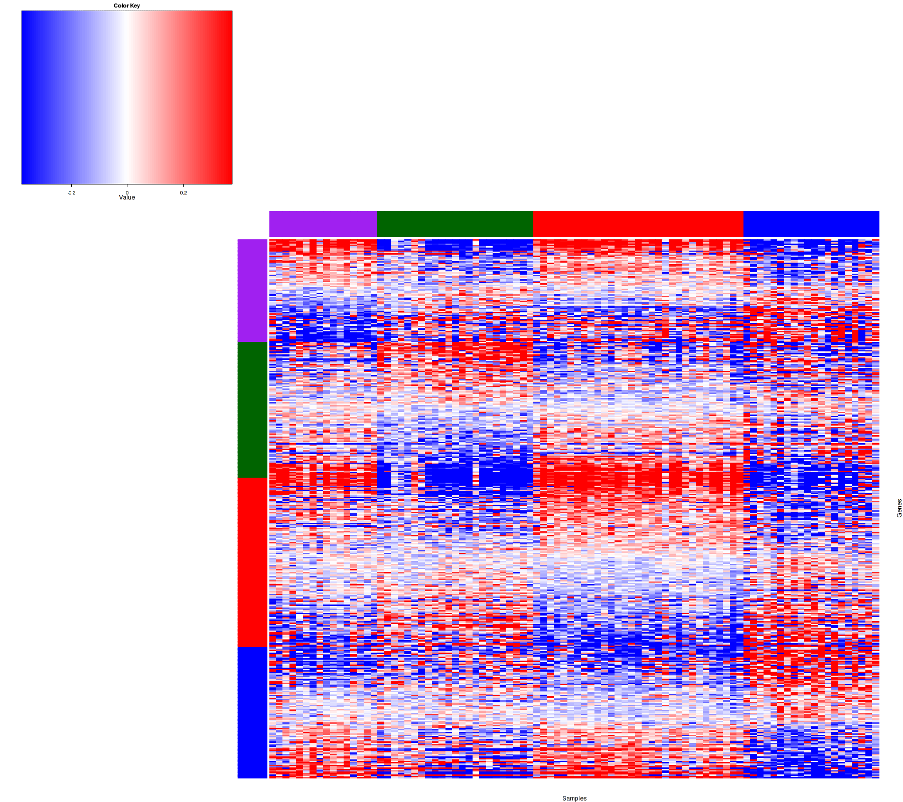Figure 1. Get High-res Image Samples were separated into 4 clusters. Shown are 90 samples and 394 marker proteins. The color bar of the row indicates the marker proteins for the corresponding cluster.