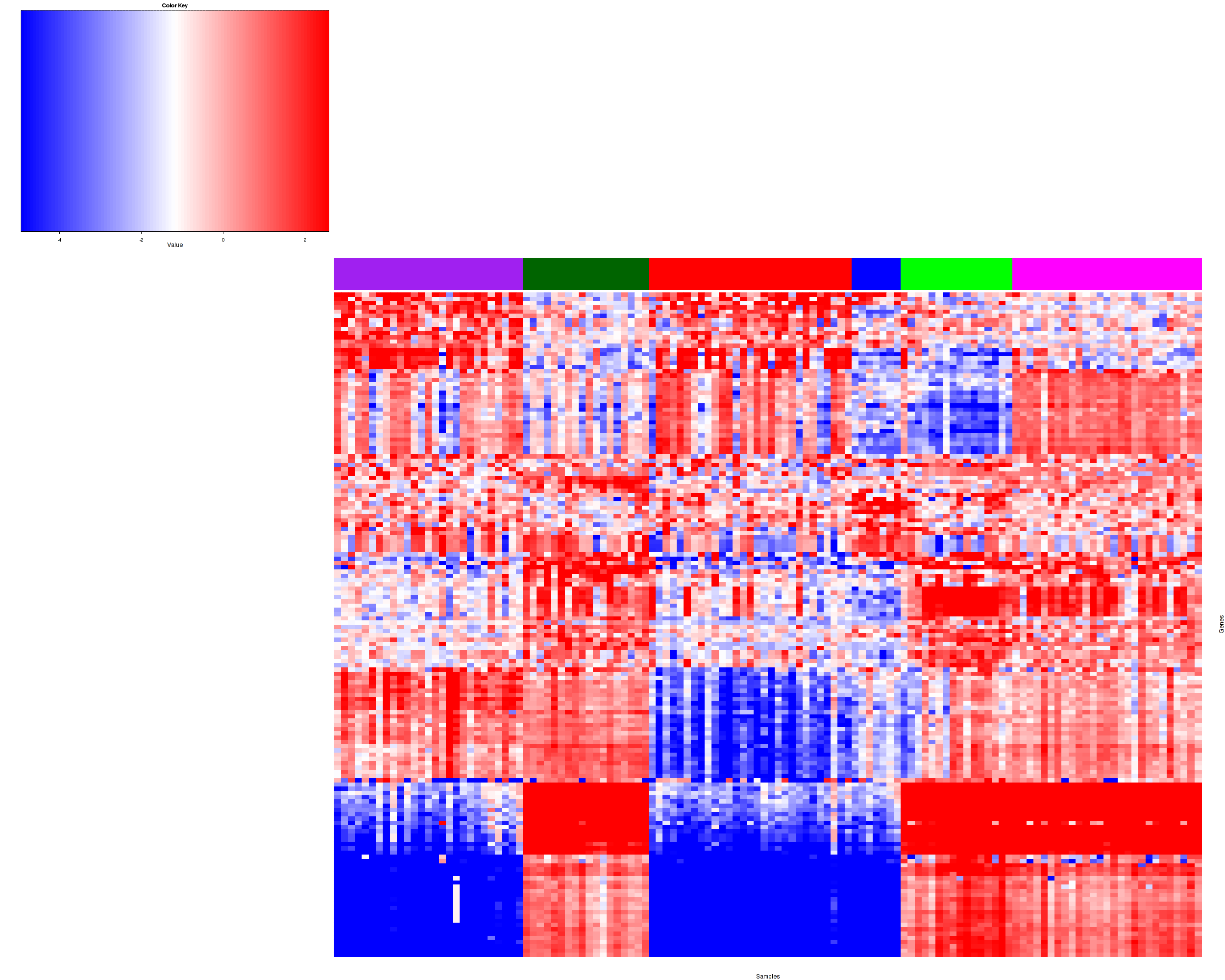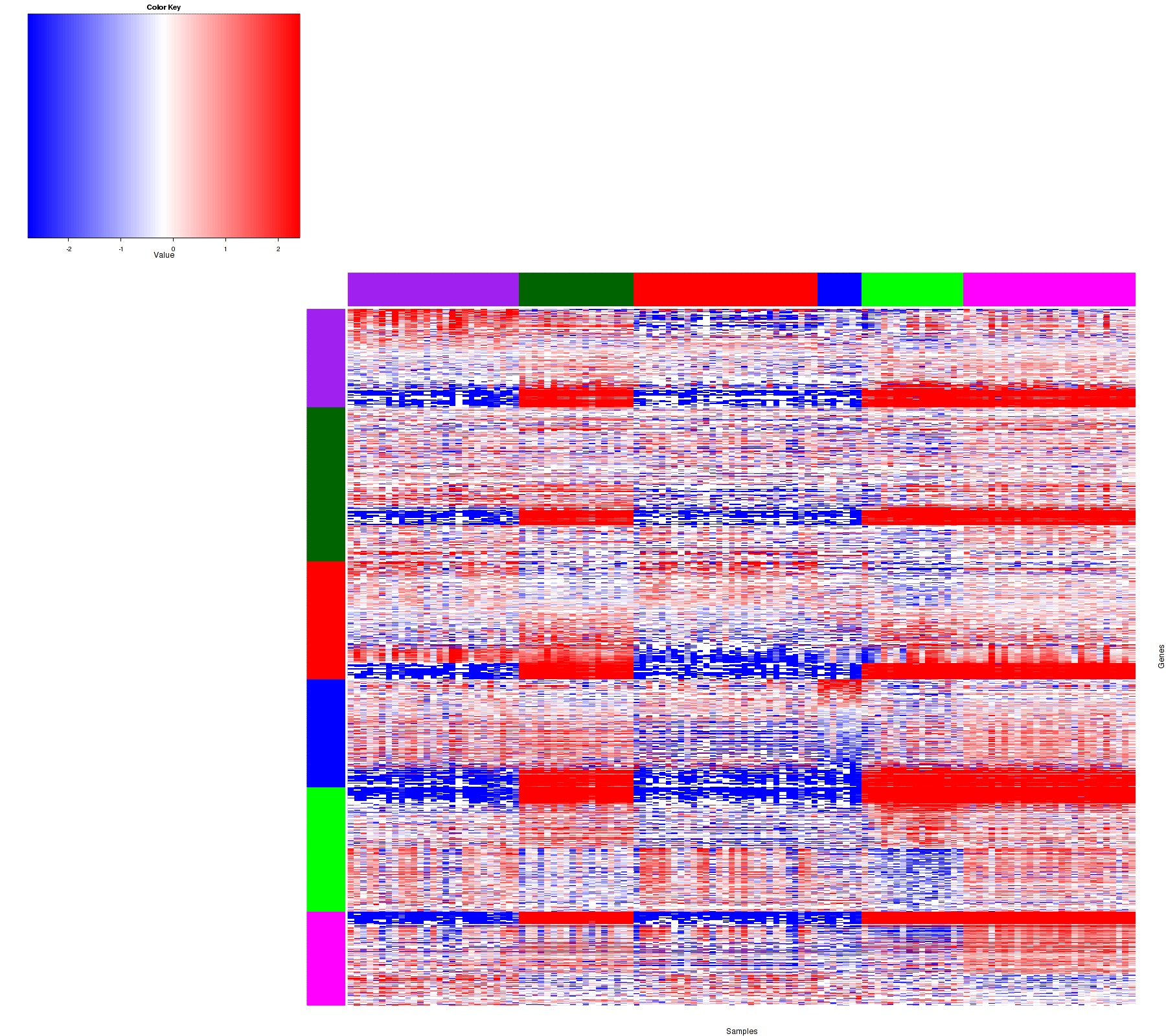 Figure 1. Get High-res Image Samples were separated into 6 clusters. Shown are 124 samples and 1650 marker miRs. The color bar of the row indicates the marker miRs for the corresponding cluster.