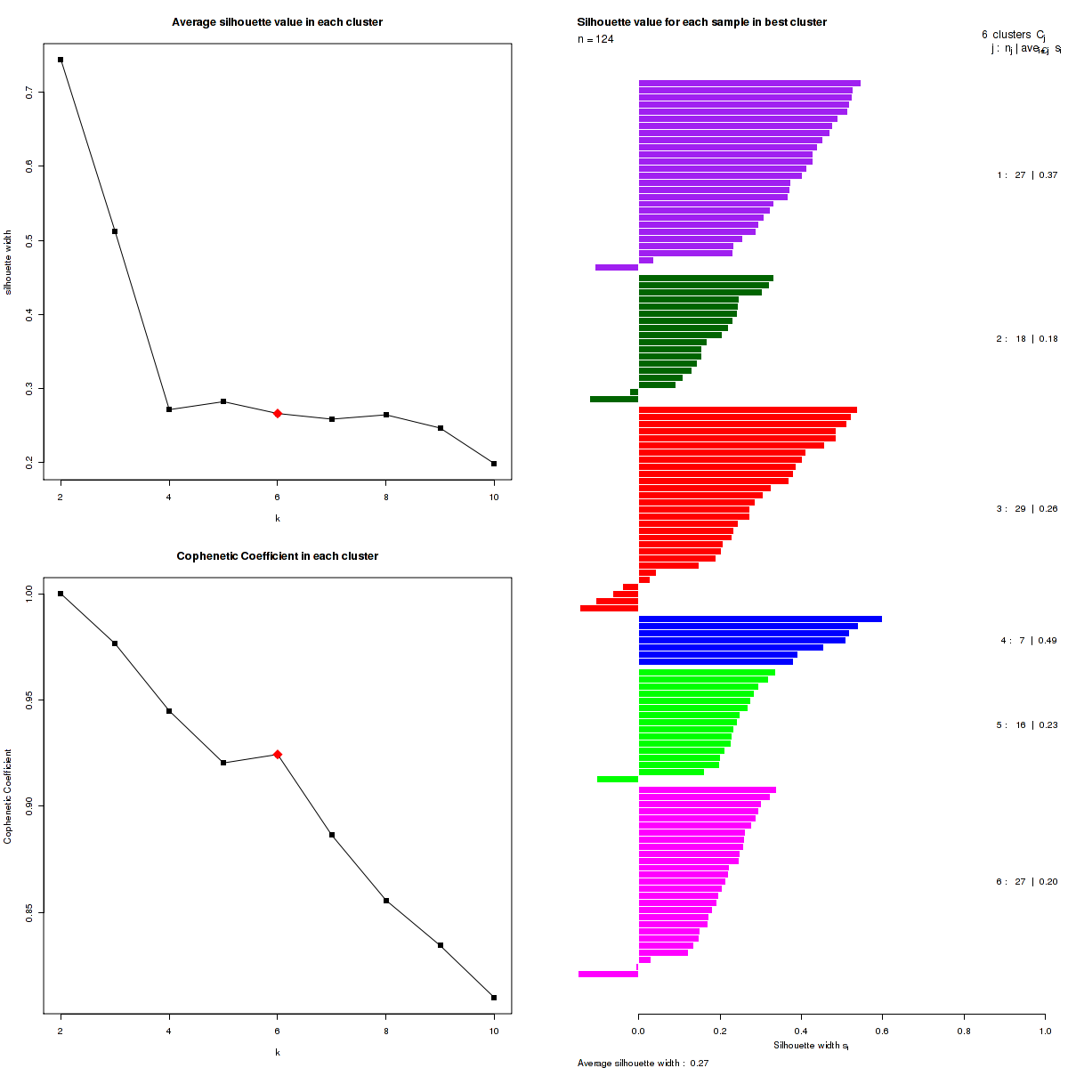 Figure 3. Get High-res Image The silhouette width was calculated for each sample and each value of k. The left upper panel shows the average silhouette width across all samples for each tested k (left upper panel). The left lower panel shows the Cophenetic Correlation Coefficients for each tested k. The right panel shows assignments of clusters to samples and the k silhouette width of each sample for the most robust clustering.