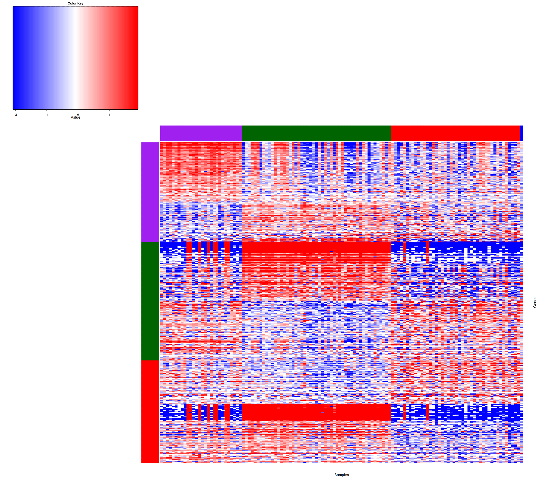 Figure 1. Get High-res Image Samples were separated into 4 clusters. Shown are 124 samples and 813 marker miRs. The color bar of the row indicates the marker miRs for the corresponding cluster.