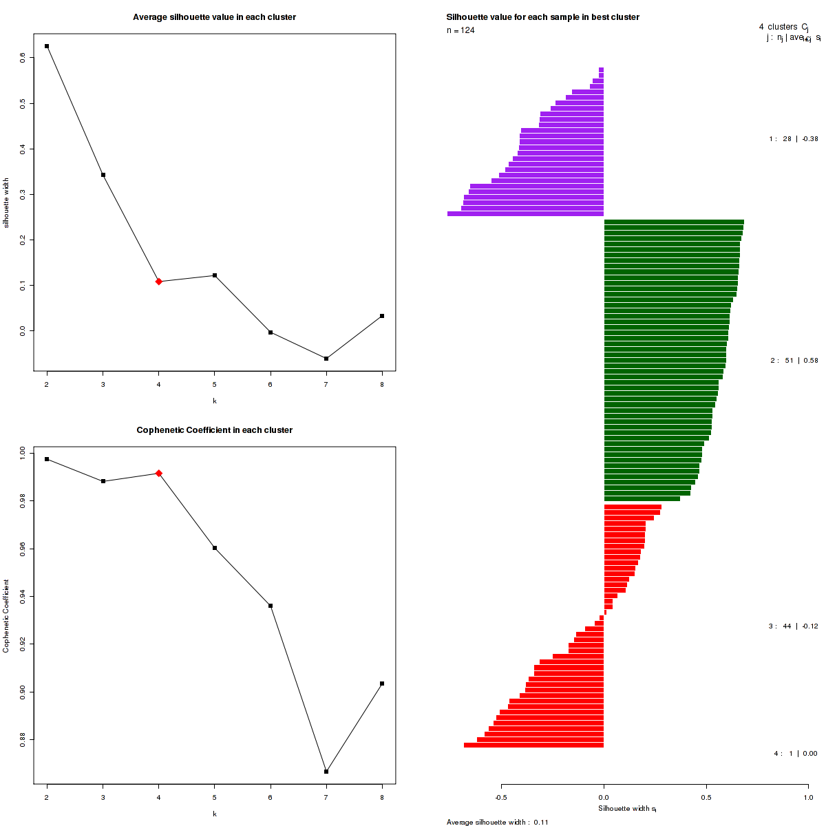 Figure 3. Get High-res Image The silhouette width was calculated for each sample and each value of k. The left upper panel shows the average silhouette width across all samples for each tested k (left upper panel). The left lower panel shows the Cophenetic Correlation Coefficients for each tested k. The right panel shows assignments of clusters to samples and the silhouette width of each sample for the most robust clustering.
