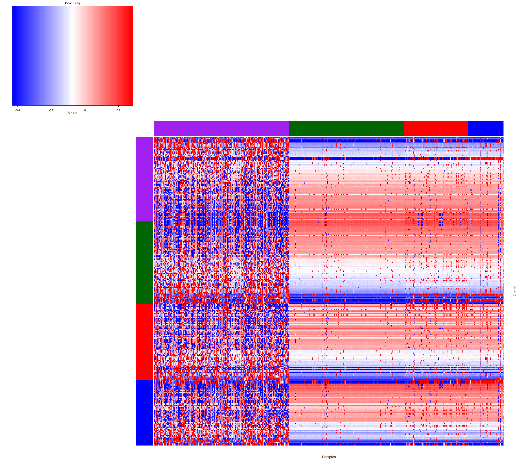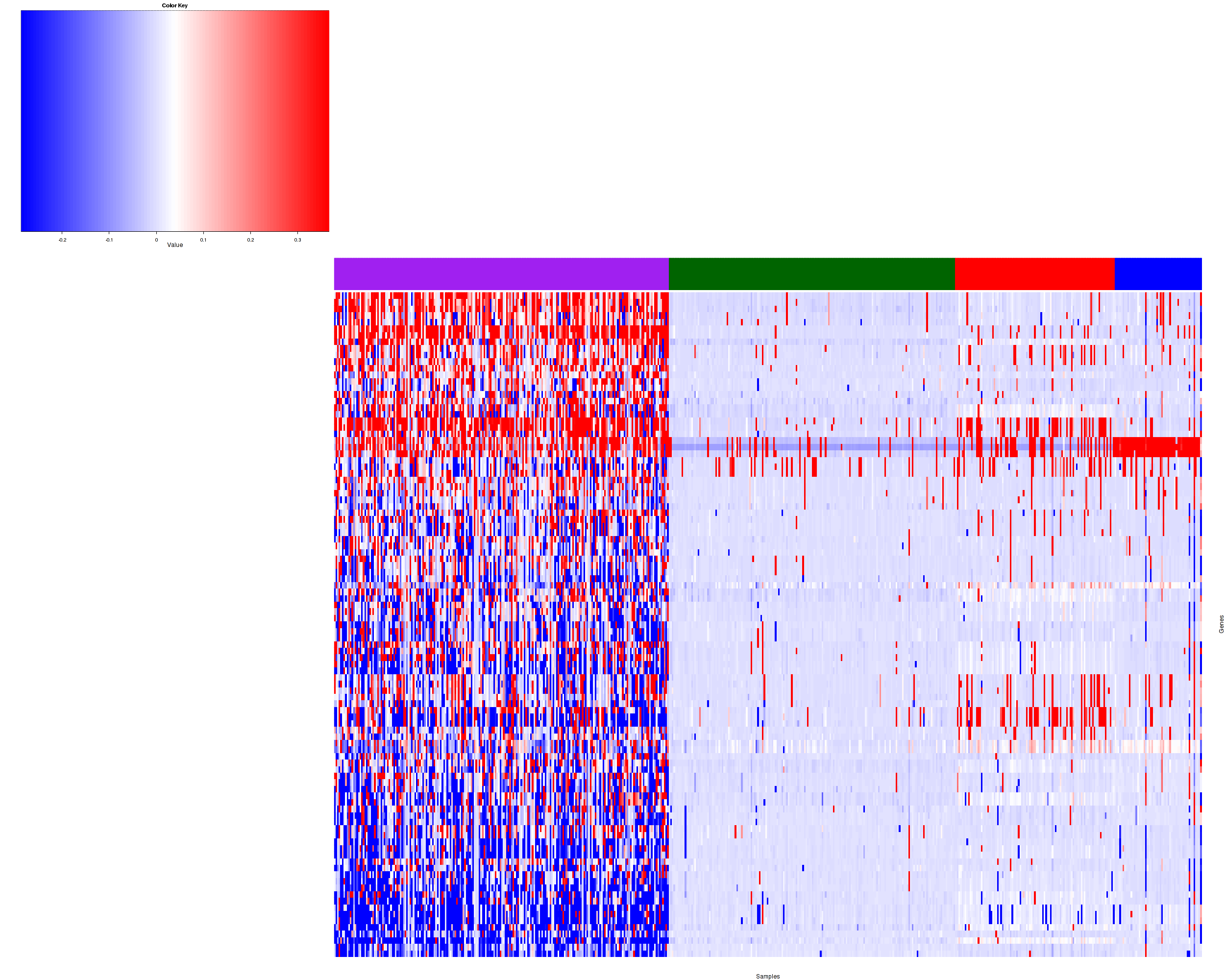 Figure 1.  Get High-res Image Samples were separated into 4 clusters. Shown are 539 samples and 259 marker focal events. The color bar of the row indicates the marker focal events for the corresponding cluster.