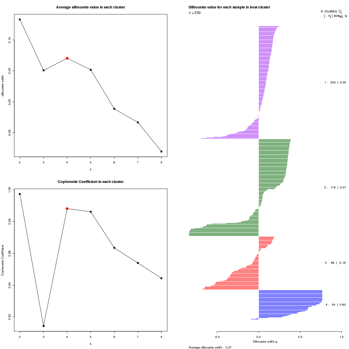 Silhouette widths, Cophenetic Correlation Coefficients and Consensus matrix