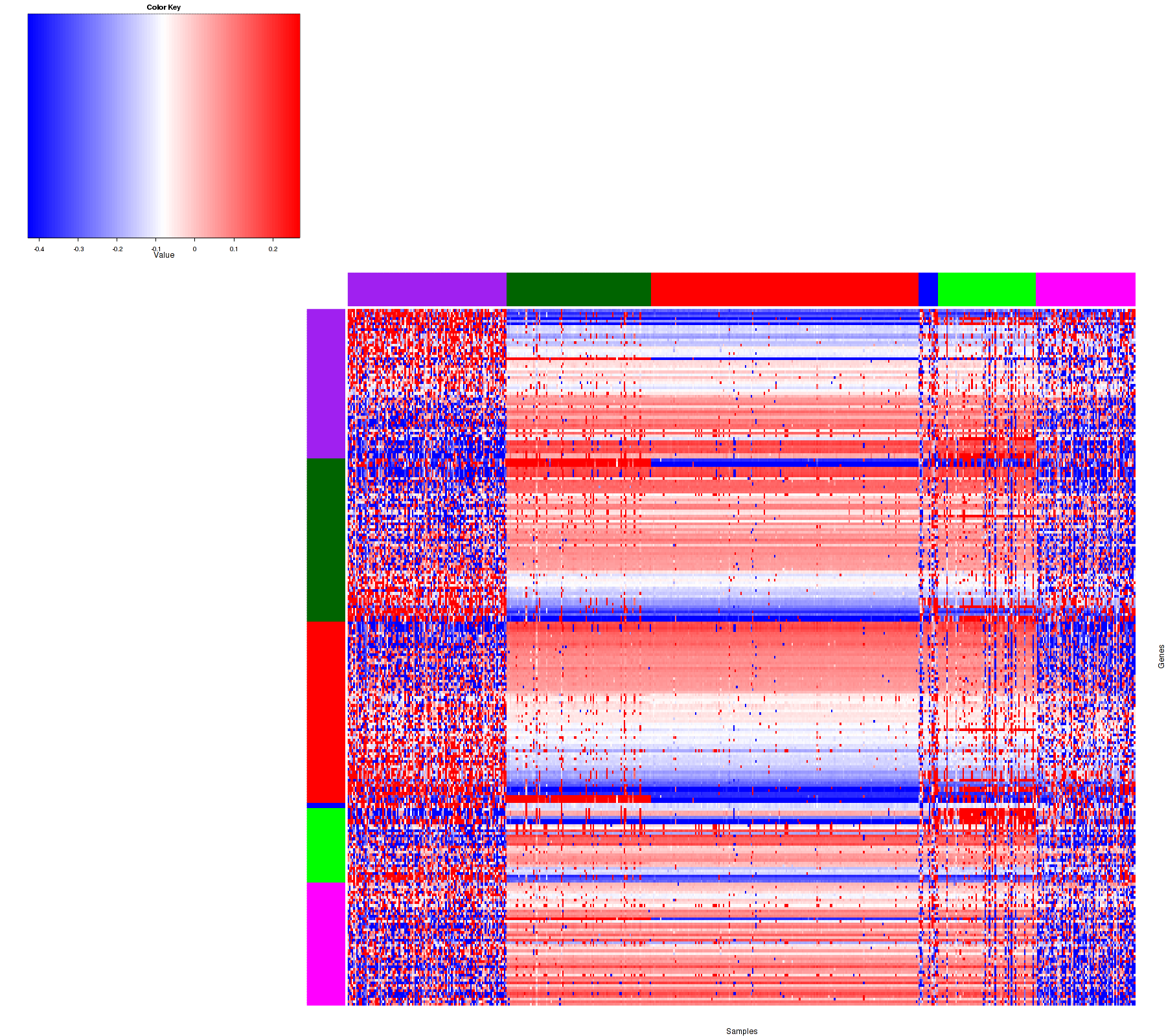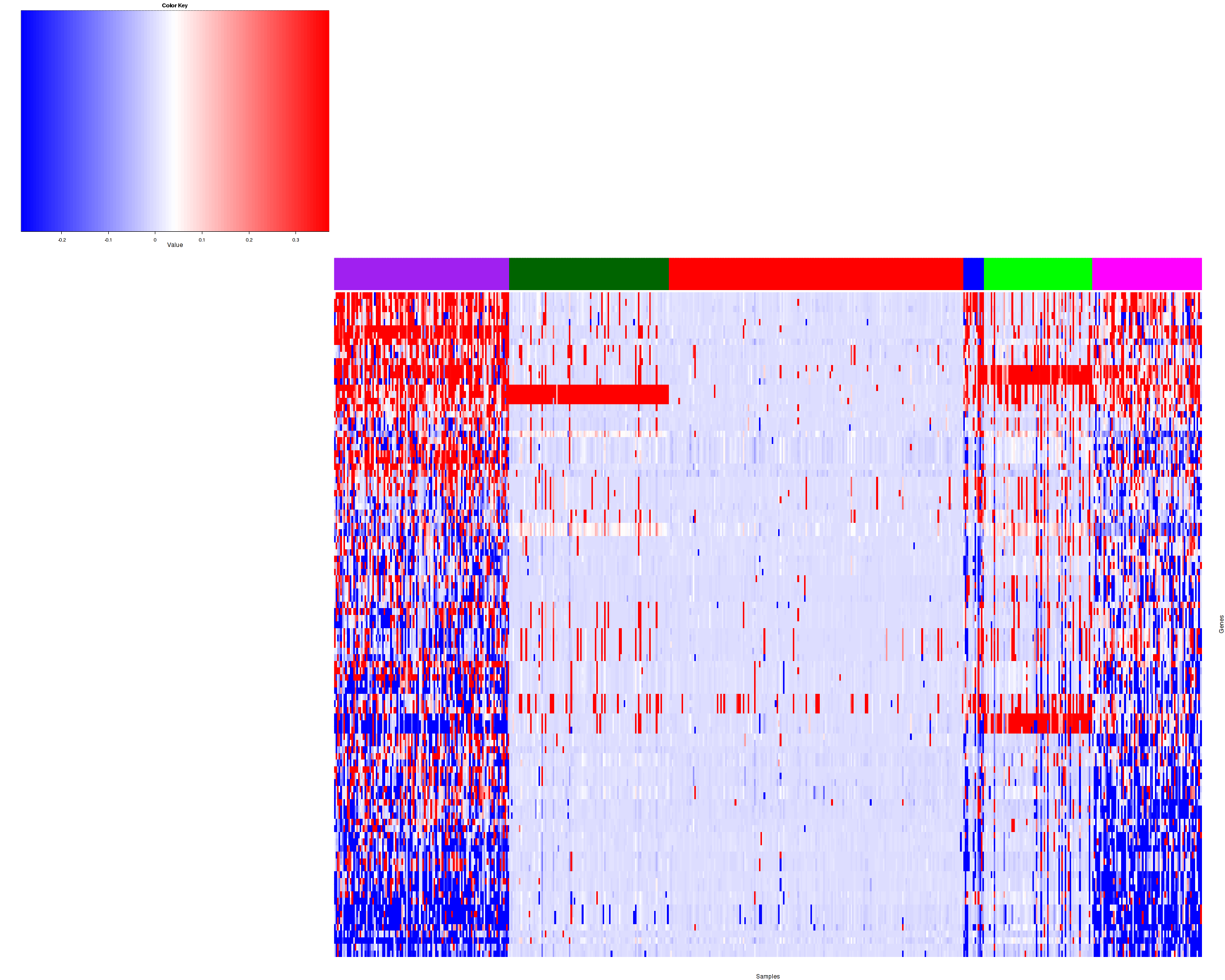 Figure 1. Get High-res Image Samples were separated into 6 clusters. Shown are 539 samples and 261 marker focal events. The color bar of the row indicates the marker focal events for the corresponding cluster.