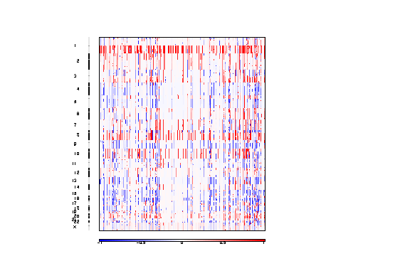 A table of chromosome arm amplification levels for each sample. Each row is a chromosome arm, and each column a sample. The data are in units of absolute copy number -2.