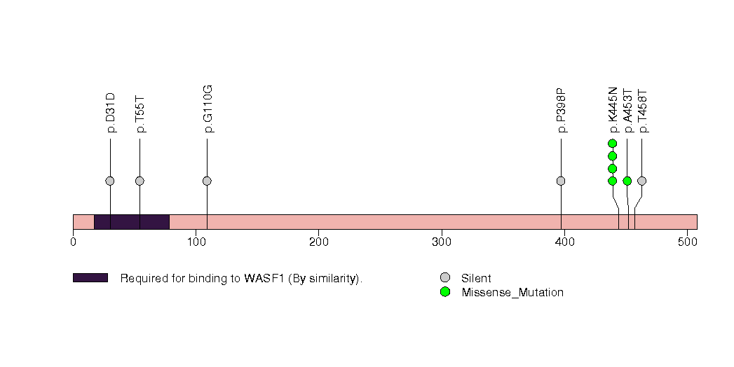 Figure S29.  This figure depicts the distribution of mutations and mutation types across the ABI1 significant gene.
