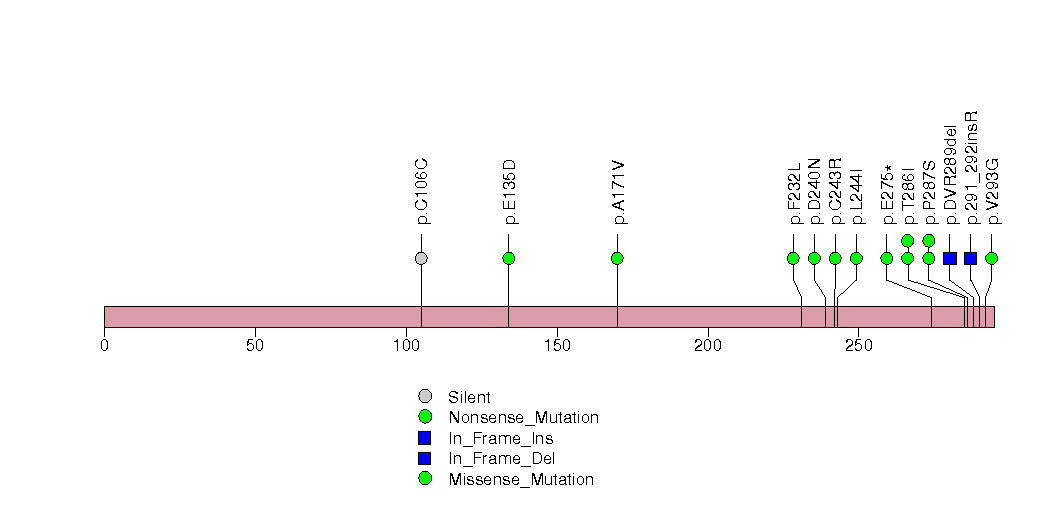 Figure S14.  This figure depicts the distribution of mutations and mutation types across the PGRMC2 significant gene.