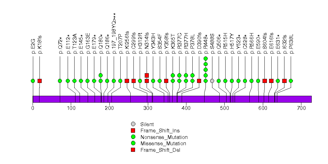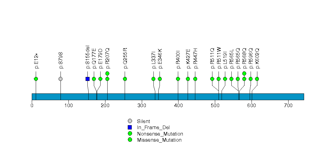 Figure S11.  This figure depicts the distribution of mutations and mutation types across the FAM118B significant gene.