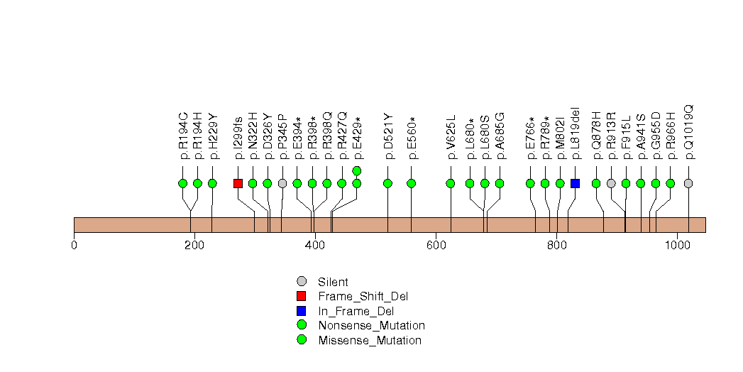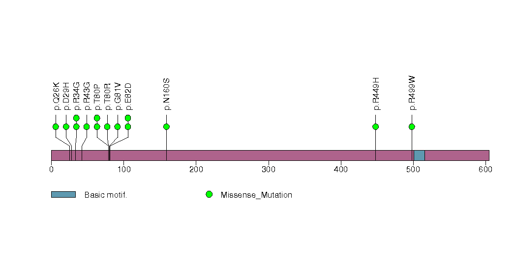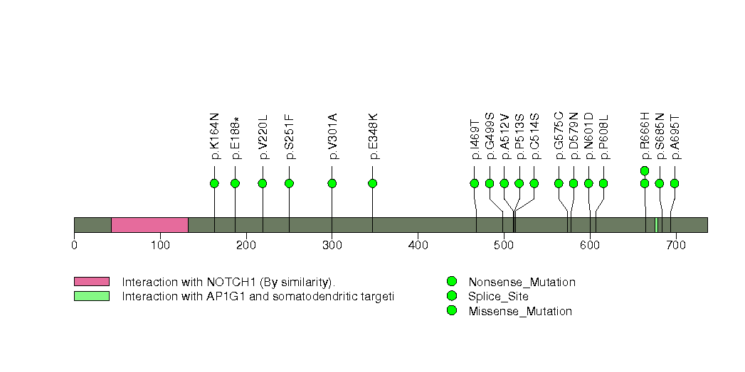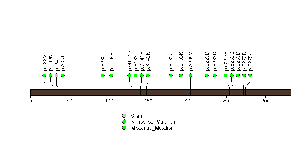 Figure S13.  This figure depicts the distribution of mutations and mutation types across the GIPC1 significant gene.