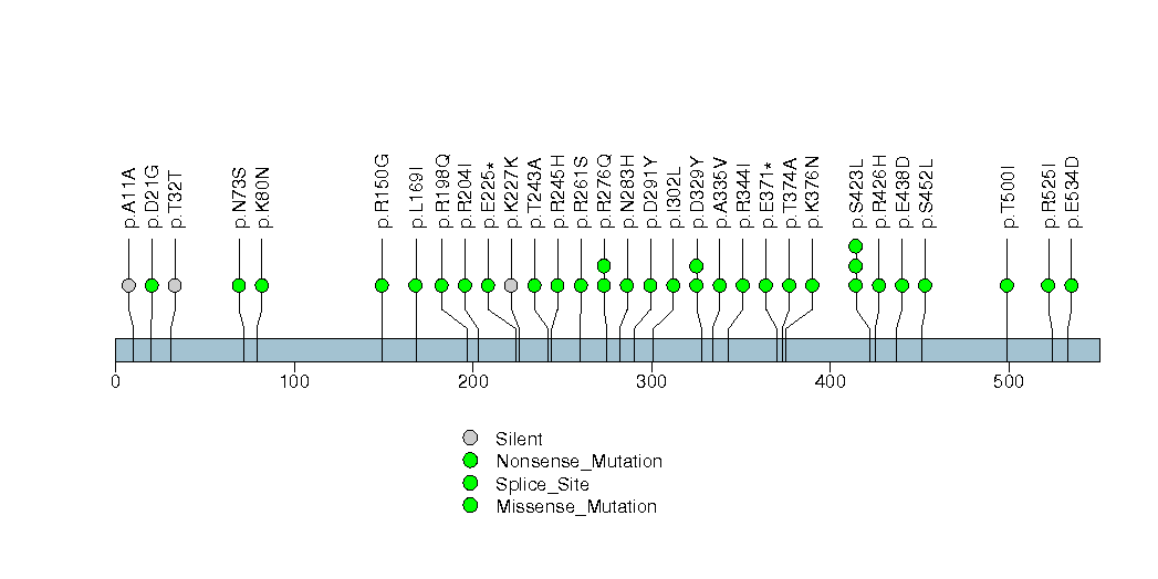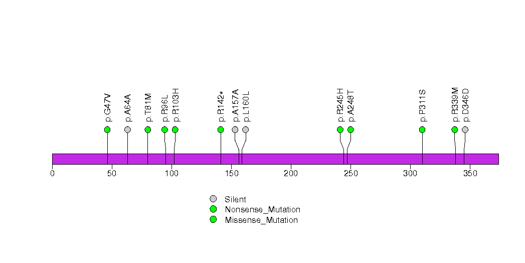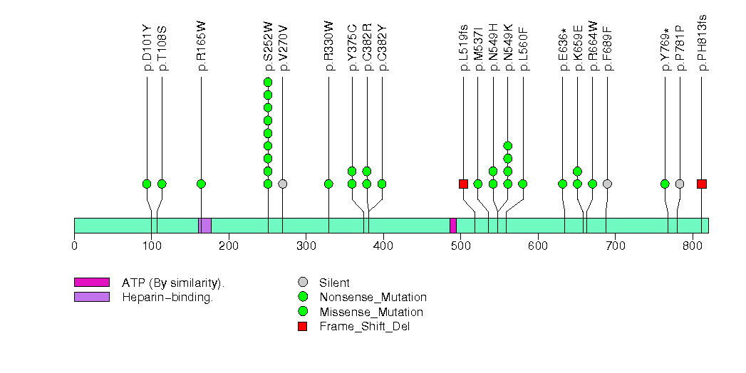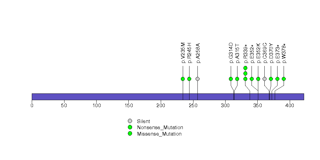 Figure S18.  This figure depicts the distribution of mutations and mutation types across the P2RY11 significant gene.