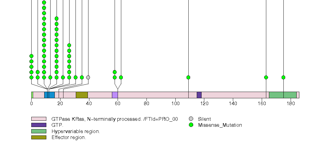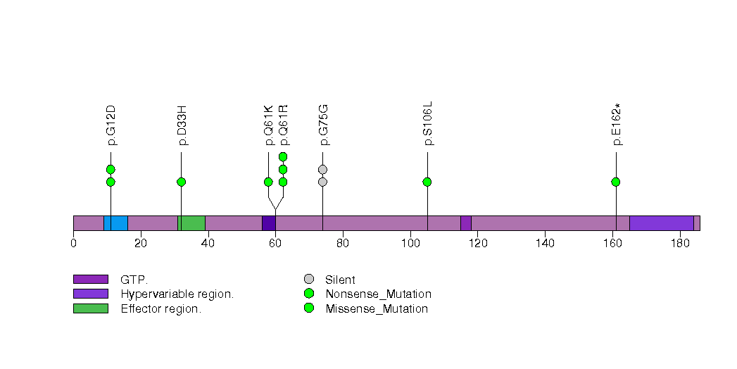 Figure S31.  This figure depicts the distribution of mutations and mutation types across the NRAS significant gene.
