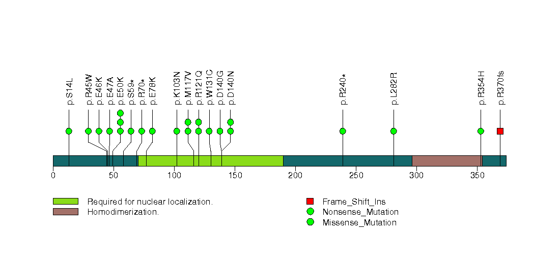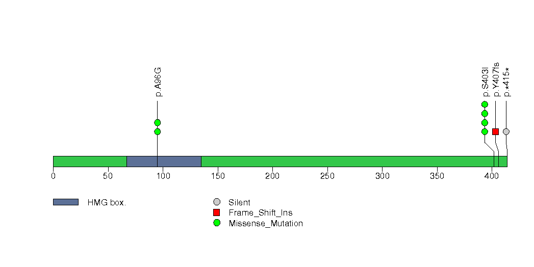 Figure S22.  This figure depicts the distribution of mutations and mutation types across the SOX17 significant gene.