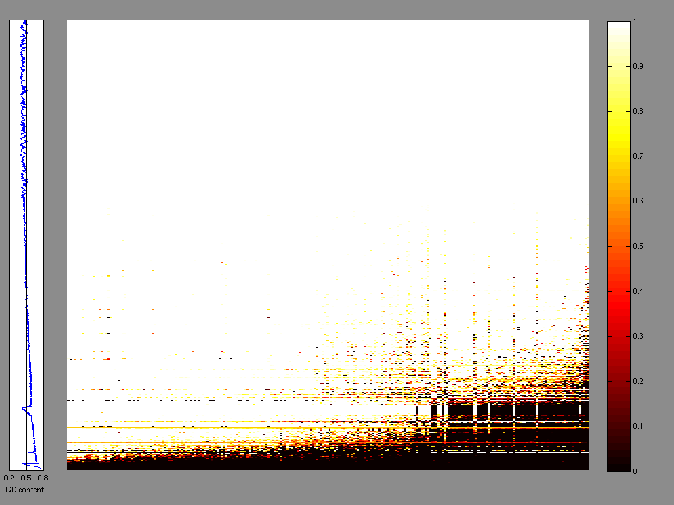 The x axis represents the samples. The y axis represents the exons, one row per exon, and they are sorted by average coverage across samples. For exons with exactly the same average coverage, they are sorted next by the %GC of the exon. (The secondary sort is especially useful for the zero-coverage exons at the bottom). If the figure is unpopulated, then full coverage is assumed (e.g. MutSig CV doesn't use WIGs and assumes full coverage).