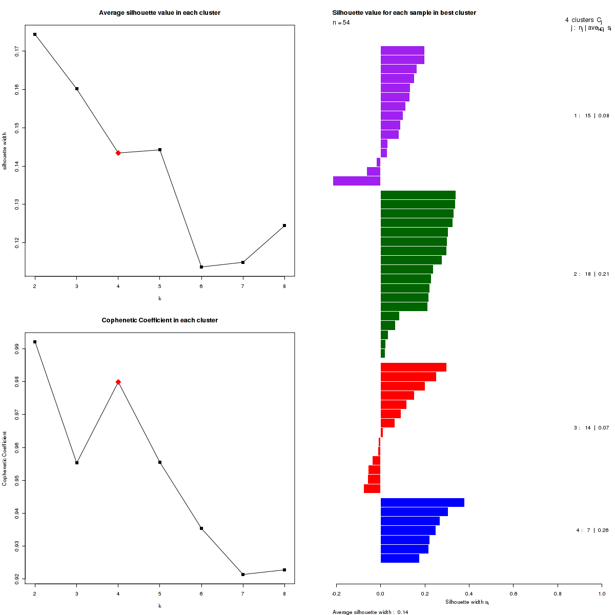 The most robust consensus NMF clustering of 54 samples using the 1500 most variable genes was identified for k = 4 clusters. We computed the clustering for k = 2 to k = 10 and uused the cophenetic correlation coefficient and the average silhouette width calculation to determine the robust clusters.