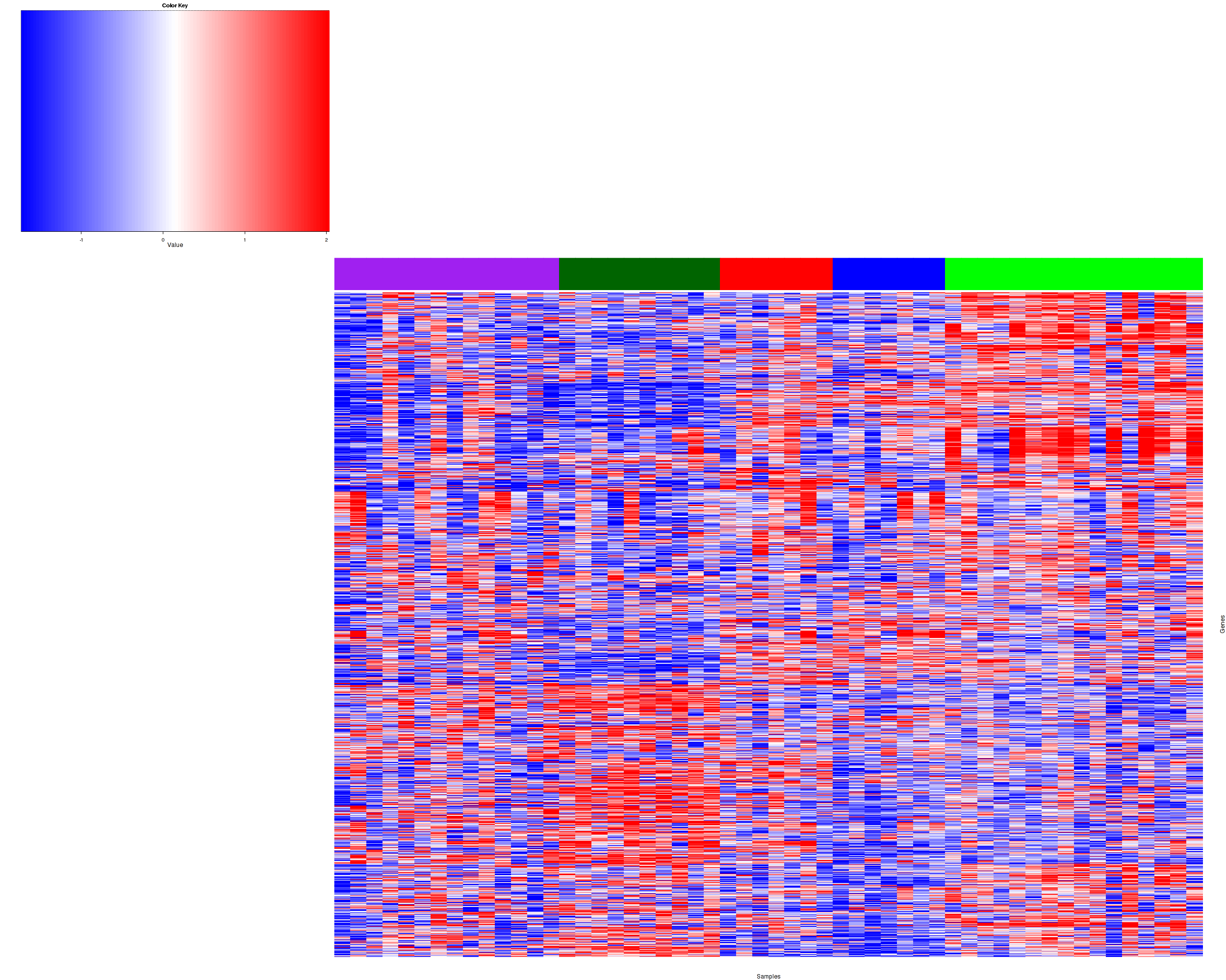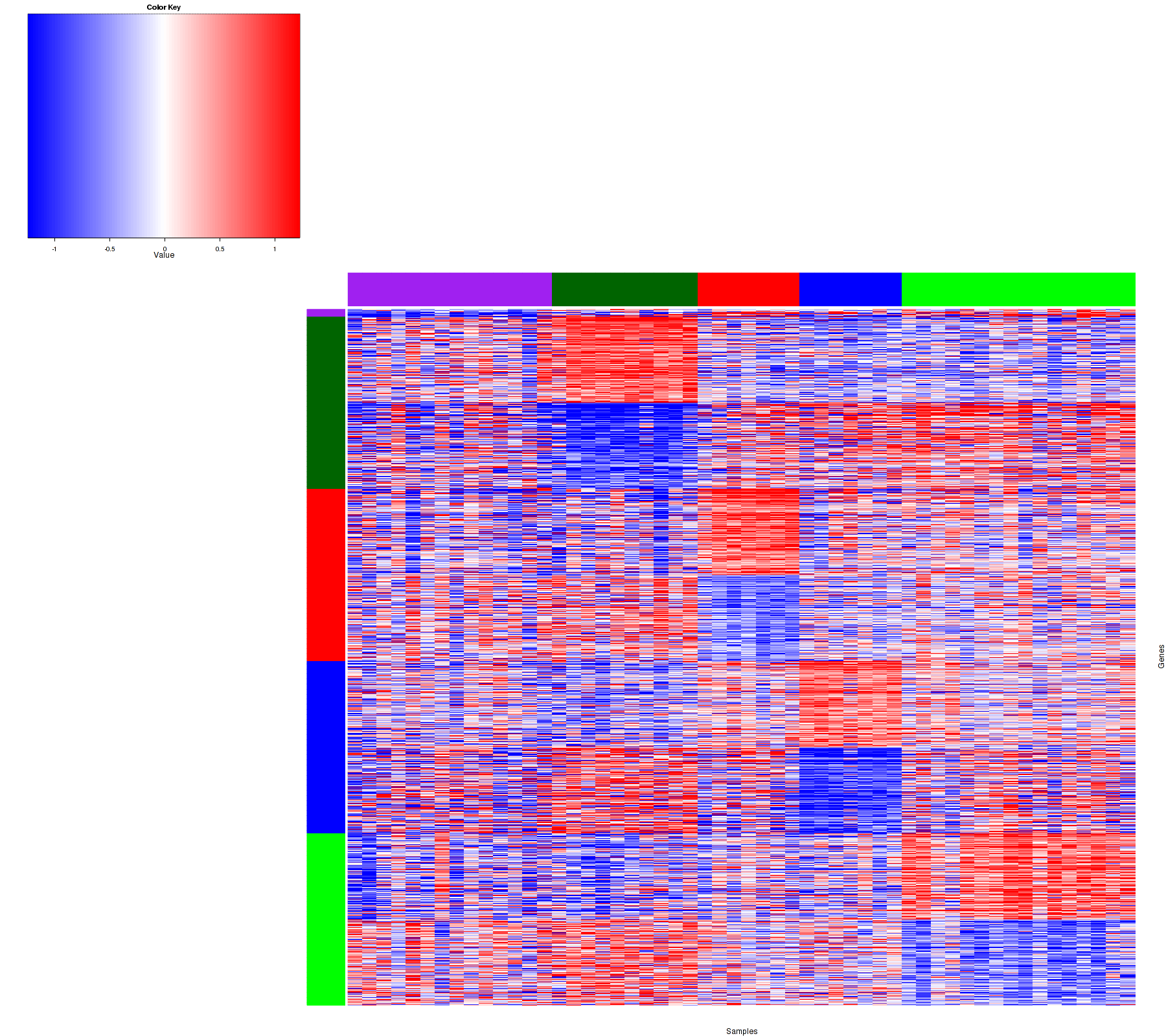Figure 1. Get High-res Image Samples were separated into 5 clusters. Shown are 54 samples and 1213 marker genes. The color bar of the row indicates the marker genes for the corresponding cluster.