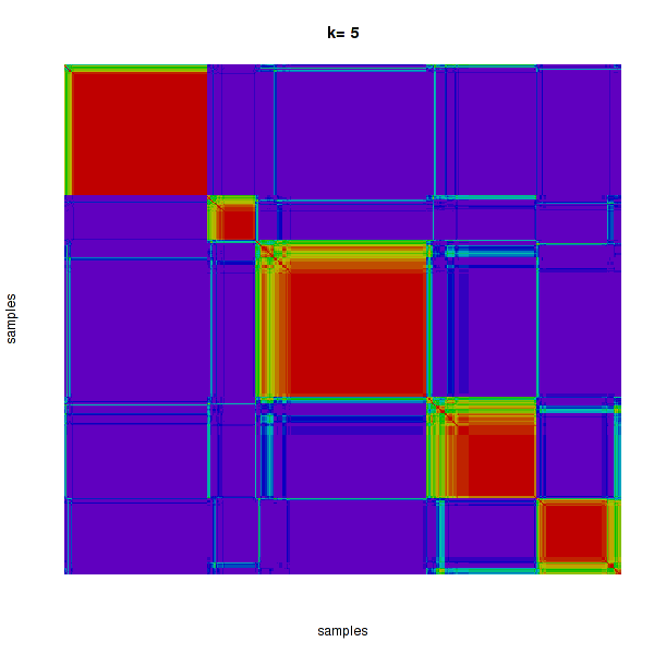 Figure 4. Get High-res Image The consensus matrix after clustering shows 5 clusters with limited overlap between clusters.