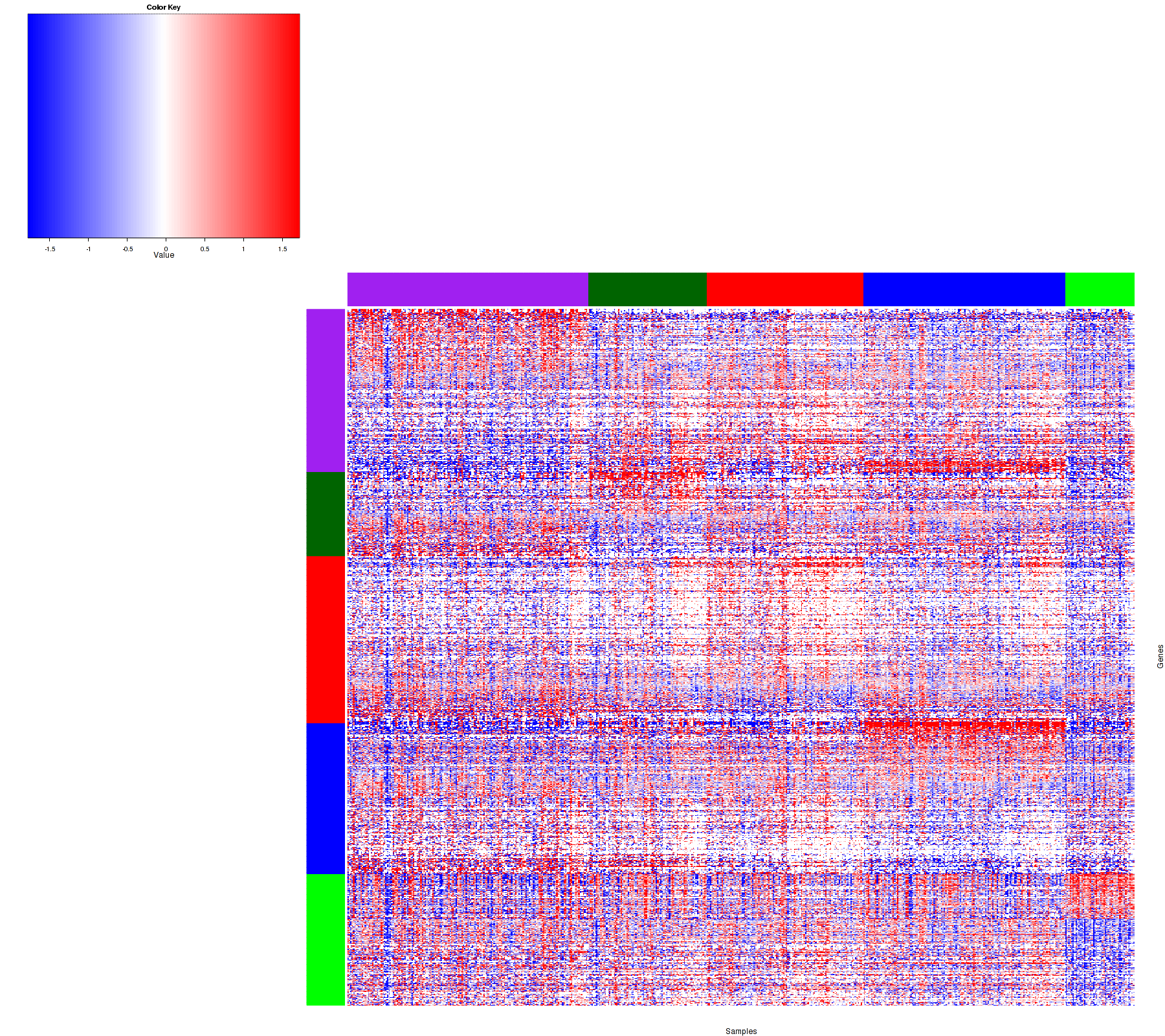 Figure 1. Get High-res Image Samples were separated into 5 clusters. Shown are 538 samples and 1204 marker miRs. The color bar of the row indicates the marker miRs for the corresponding cluster.