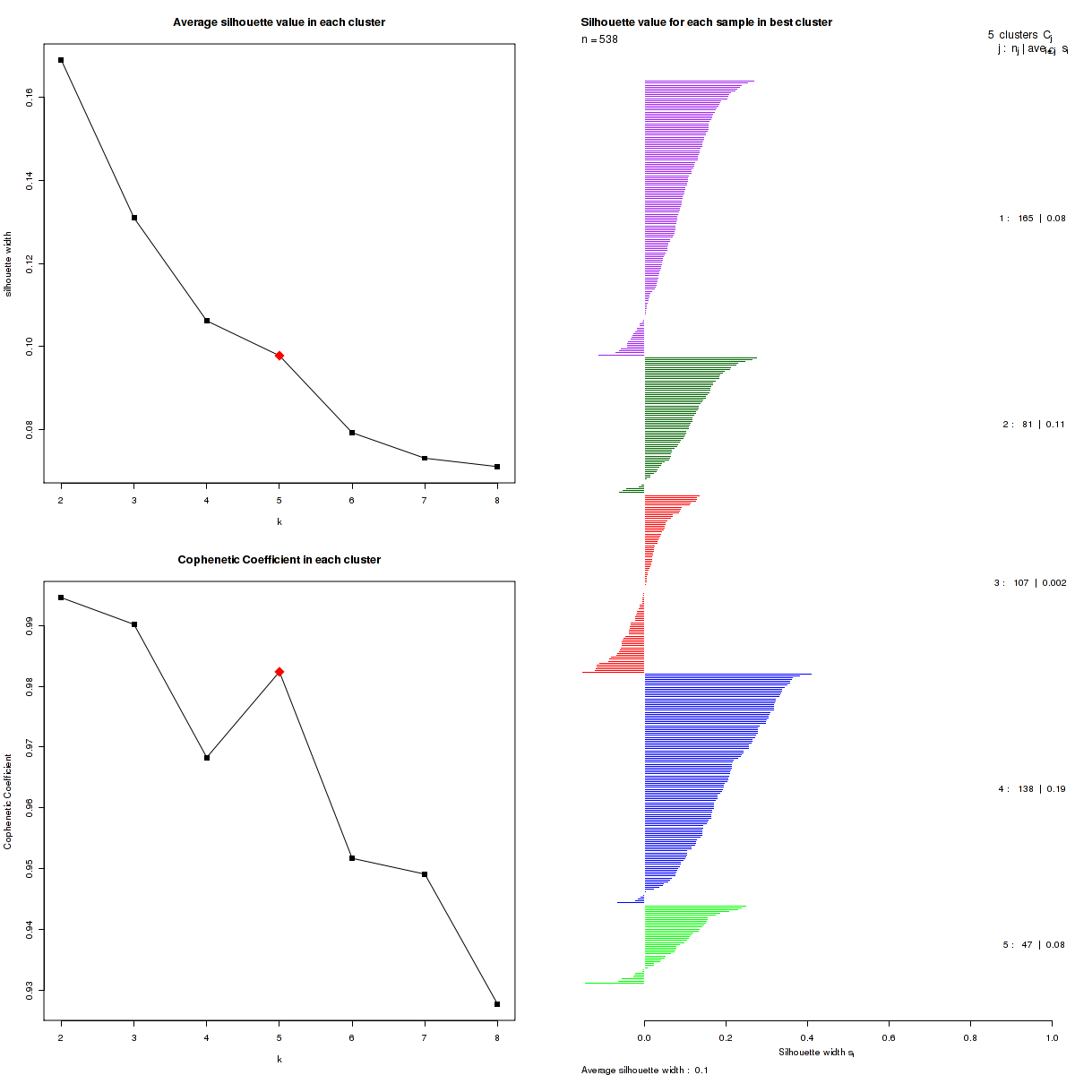 Figure 3. Get High-res Image The silhouette width was calculated for each sample and each value of k. The left upper panel shows the average silhouette width across all samples for each tested k (left upper panel). The left lower panel shows the Cophenetic Correlation Coefficients for each tested k. The right panel shows assignments of clusters to samples and the silhouette width of each sample for the most robust clustering.