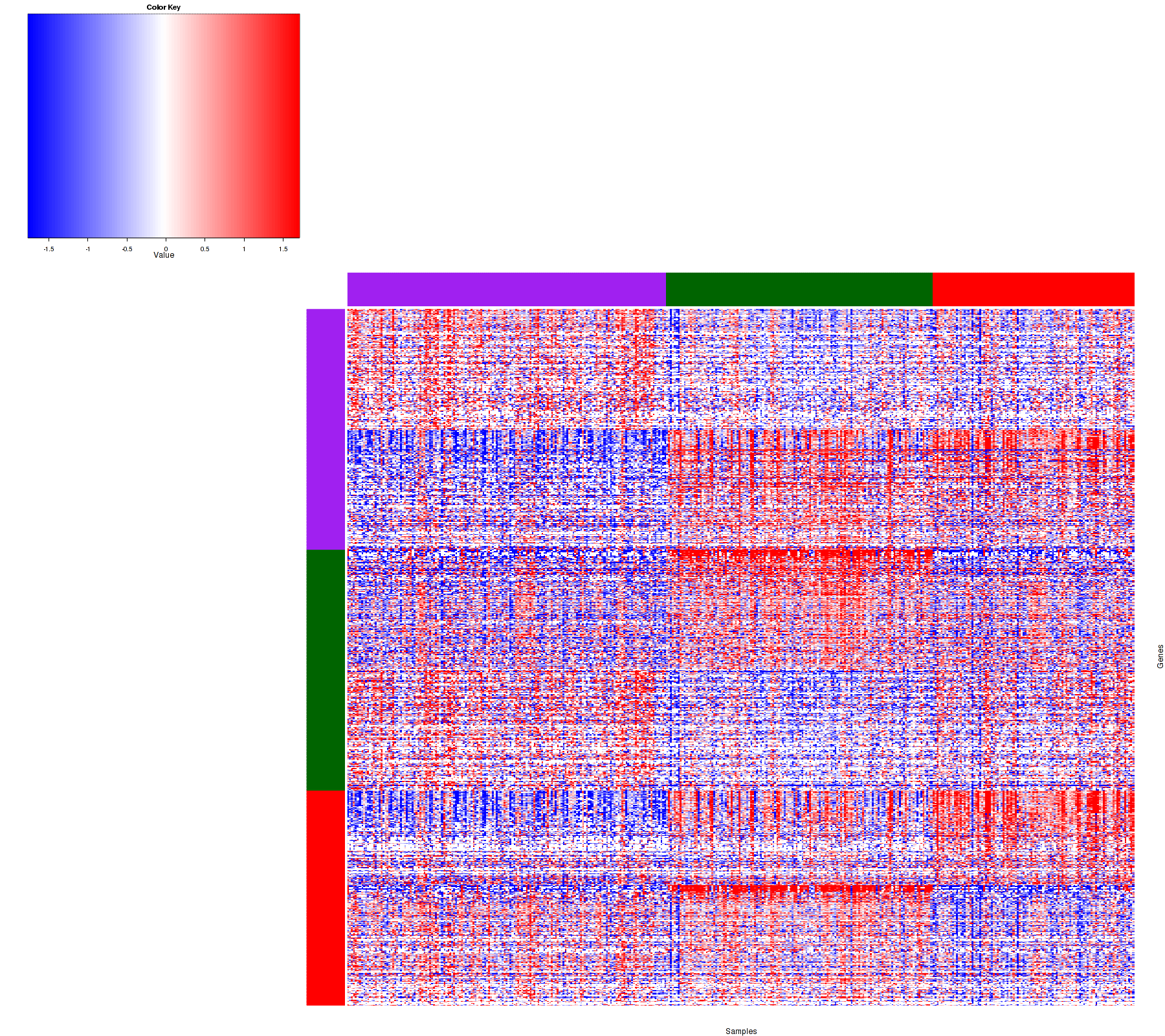 Figure 1. Get High-res Image Samples were separated into 3 clusters. Shown are 402 samples and 868 marker miRs. The color bar of the row indicates the marker miRs for the corresponding cluster.