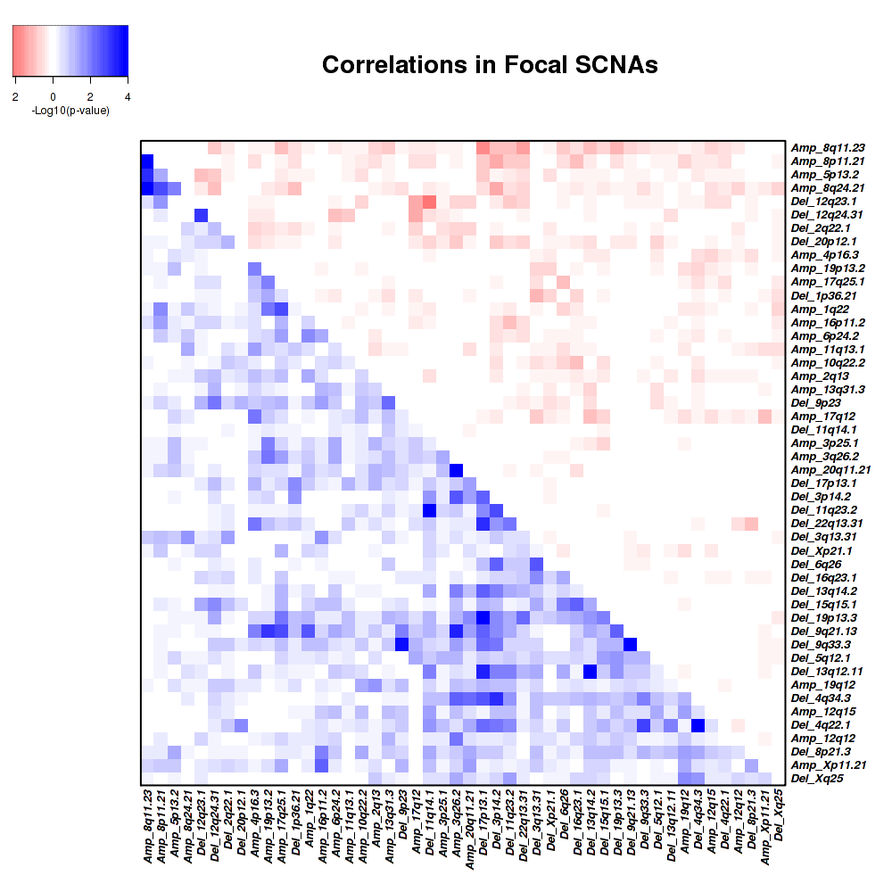 Figure 2. Get High-res Image Co-occurring and mutually-exclusive pairs for copy number variations of focal events. Blue means two events are co-occurring and red means two events are mutually-exclusive.