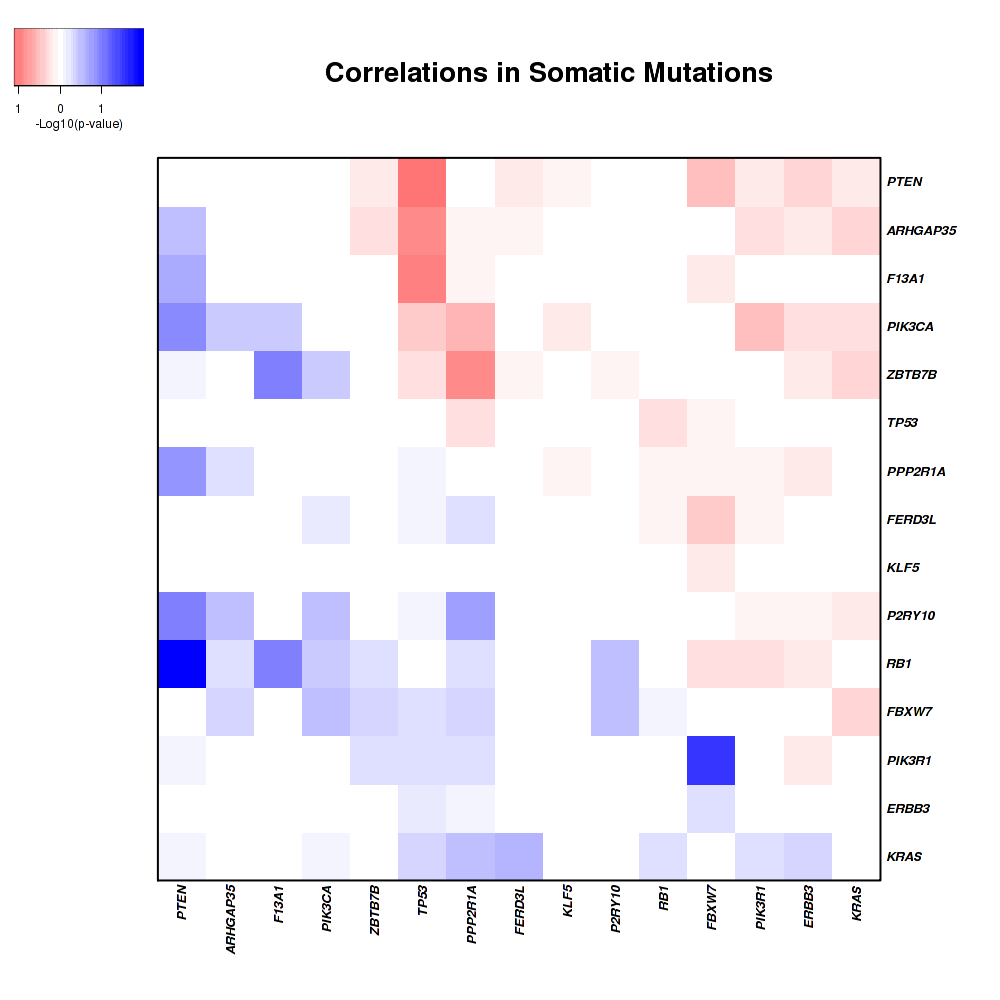 Figure 3. Get High-res Image Co-occurring and mutually-exclusive pairs for significantly mutated genes. Blue means two events are co-occurring and red means two events are mutually-exclusive.