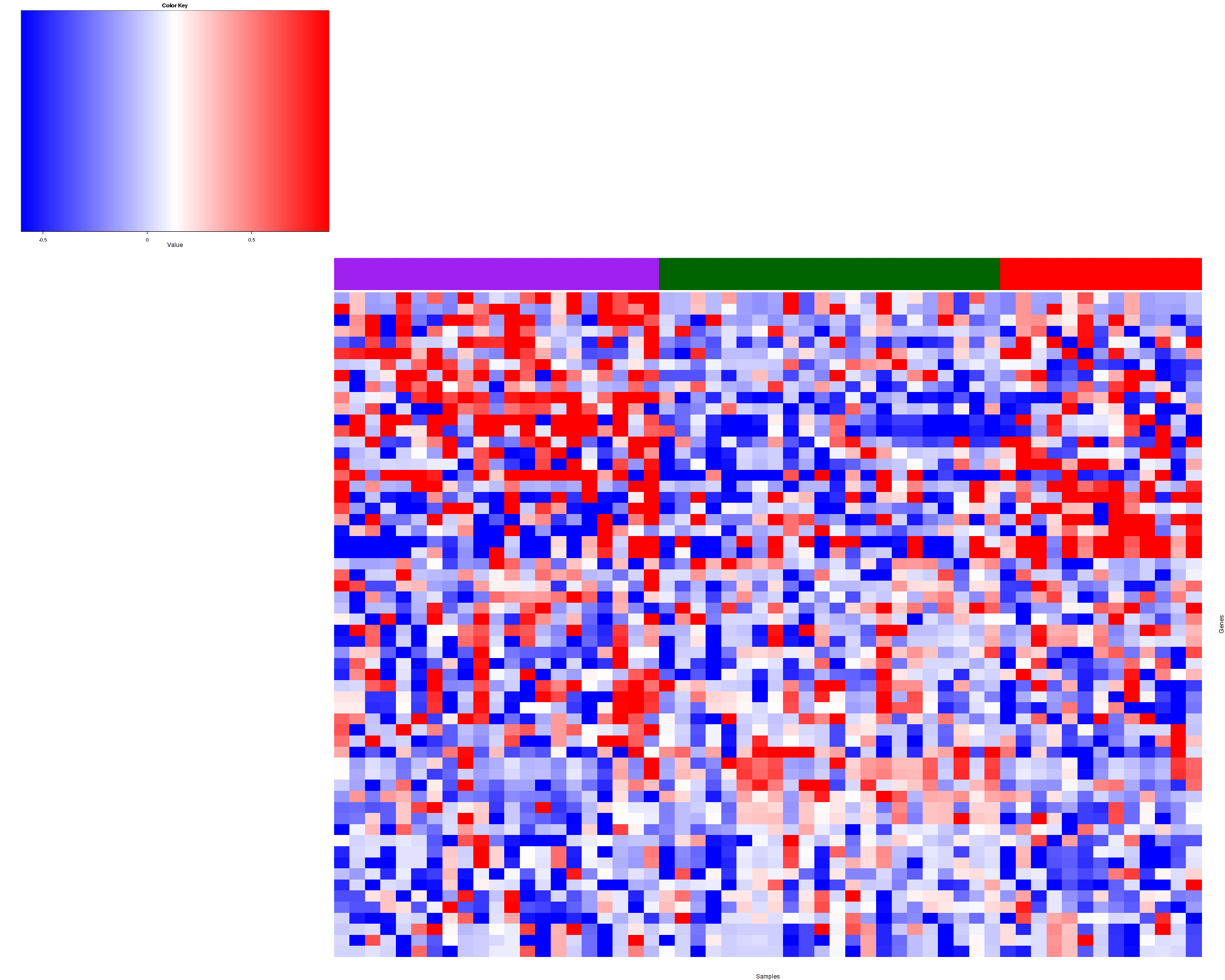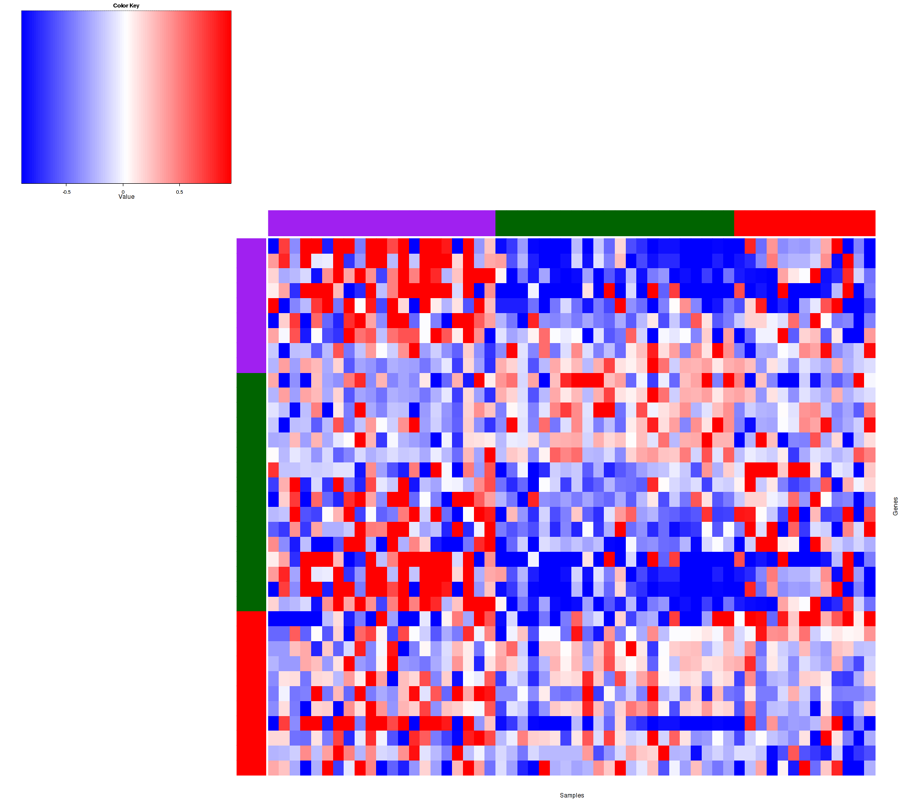 Figure 1. Get High-res Image Samples were separated into 3 clusters. Shown are 56 samples and 36 marker focal events. The color bar of the row indicates the marker focal events for the corresponding cluster.