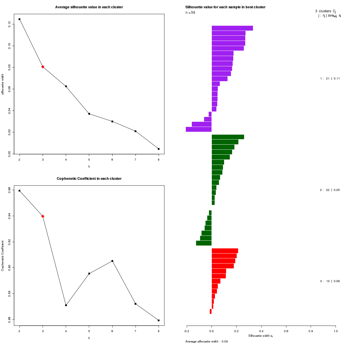 Figure 3. Get High-res Image The silhouette width was calculated for each sample and each value of k. The left panel shows the average silhouette width across all samples for each tested k (left panel). The right panels shows assignments of clusters to samples and the silhouette width of each sample for the most robust clustering.