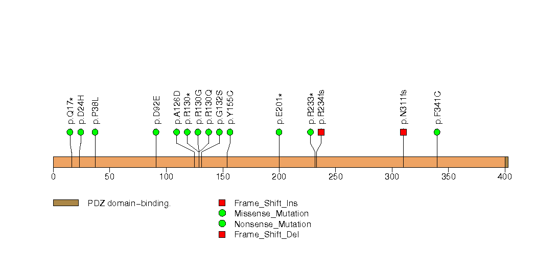 Figure S4. This figure depicts the distribution of mutations and mutation types across the PTEN significant gene.