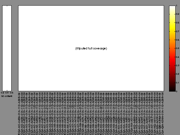 The x axis represents the samples. The y axis represents the exons, one row per exon, and they are sorted by average coverage across samples. For exons with exactly the same average coverage, they are sorted next by the %GC of the exon. (The secondary sort is especially useful for the zero-coverage exons at the bottom). If the figure is unpopulated, then full coverage is assumed (e.g. MutSig CV doesn't use WIGs and assumes full coverage).