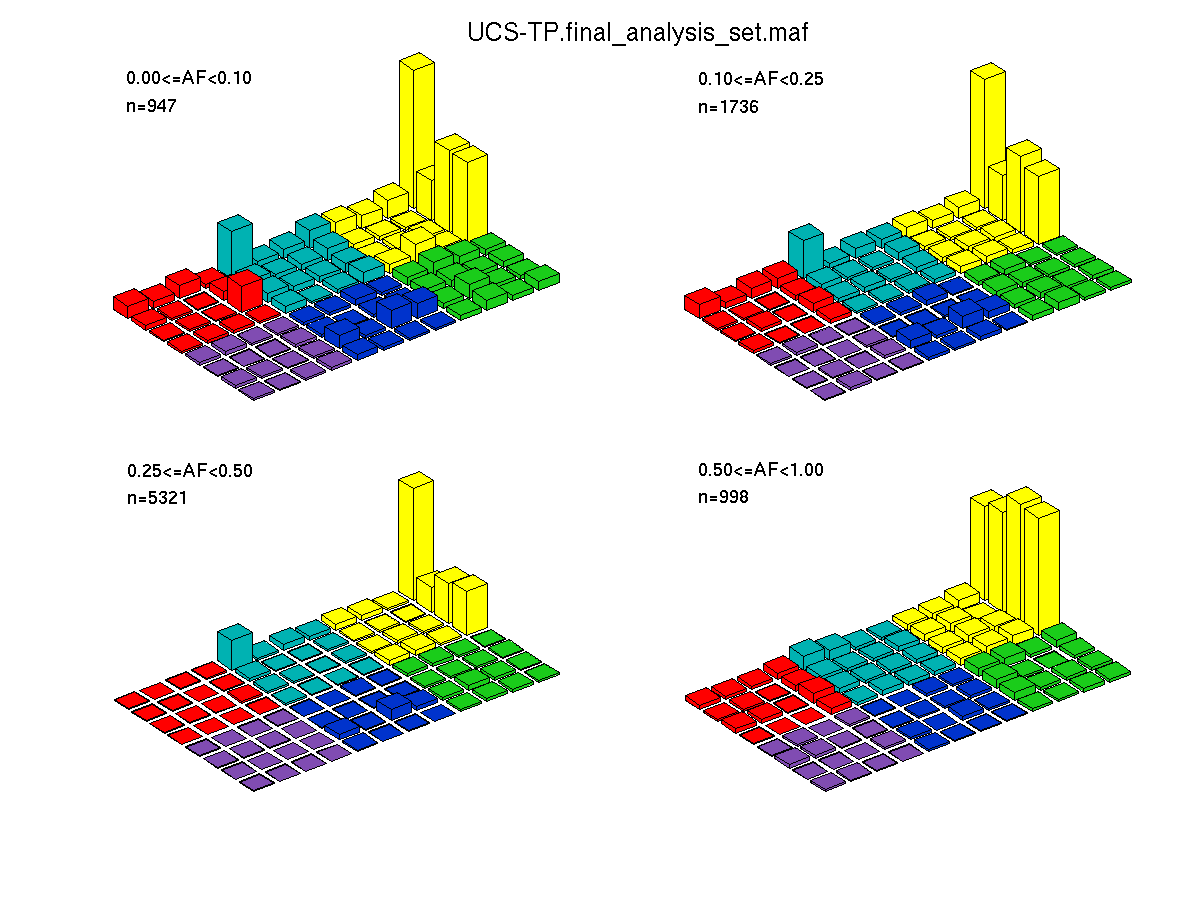 The mutation spectrum is depicted in the lego plots below in which the 96 possible mutation types are subdivided into six large blocks, color-coded to reflect the base substitution type. Each large block is further subdivided into the 16 possible pairs of 5' and 3' neighbors, as listed in the 4x4 trinucleotide context legend. The height of each block corresponds to the mutation frequency for that kind of mutation (counts of mutations normalized by the base coverage in a given bin). The shape of the spectrum is a signature for dominant mutational mechanisms in different tumor types.