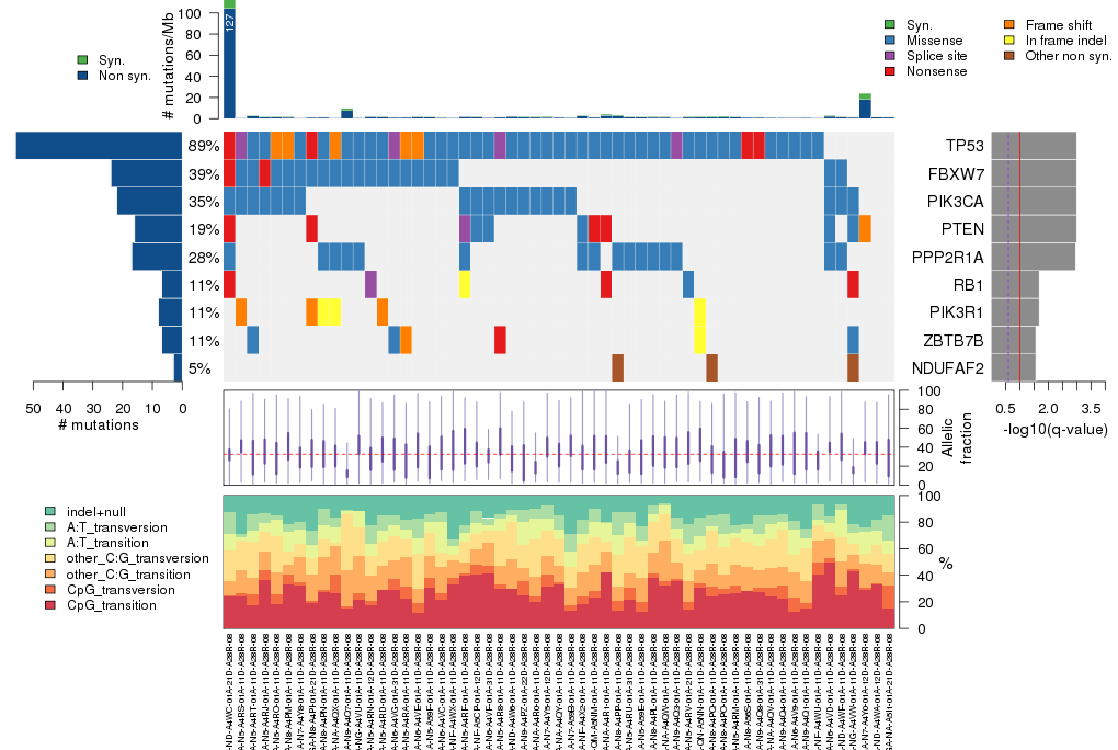Figure 5. Get High-res Image The matrix in the center of the figure represents individual mutations in patient samples, color-coded by type of mutation, for the significantly mutated genes. The rate of synonymous and non-synonymous mutations is displayed at the top of the matrix. The barplot on the left of the matrix shows the number of mutations in each gene. The percentages represent the fraction of tumors with at least one mutation in the specified gene. The barplot to the right of the matrix displays the q-values for the most significantly mutated genes. The purple boxplots below the matrix (only displayed if required columns are present in the provided MAF) represent the distributions of allelic fractions observed in each sample. The plot at the bottom represents the base substitution distribution of individual samples, using the same categories that were used to calculate significance.