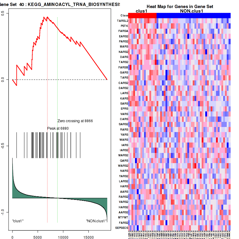 Figure S1. Get High-res Image This plot shows mRNAseq_cNMF expression data heatmap (on the left) a RunningEnrichmentScore(RES) plot (on the top right) and a Signal2Noise(S2N) plot (on the bottom right) of genes in the pathway: KEGG AMINOACYL TRNA BIOSYNTHESIS.