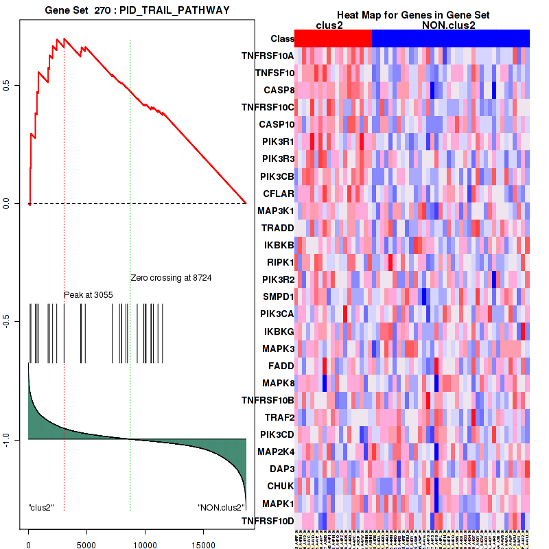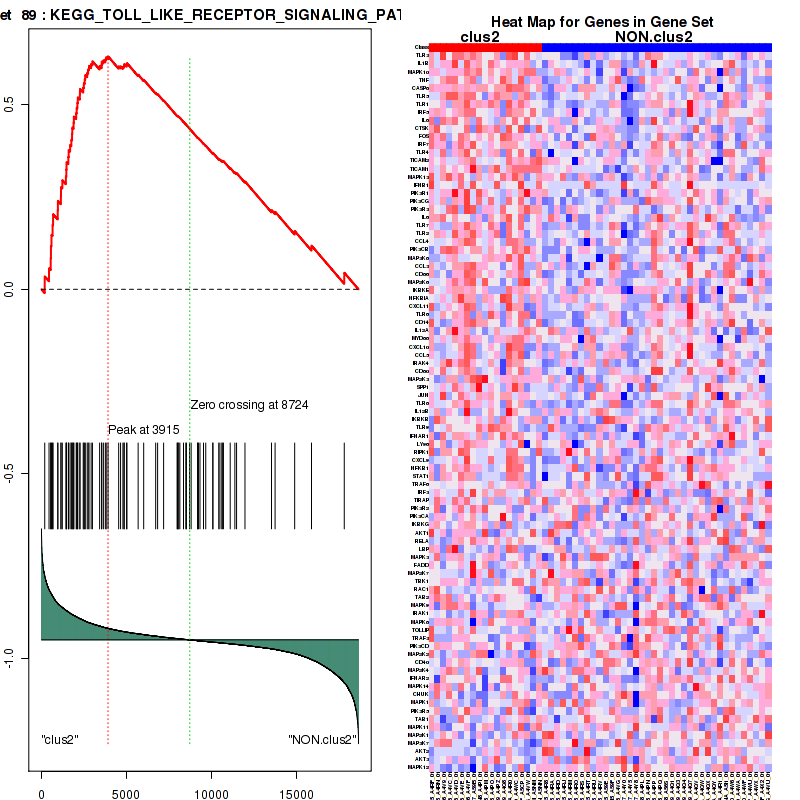 Top enriched gene sets are KEGG TOLL LIKE RECEPTOR SIGNALING PATHWAY, BIOCARTA FAS PATHWAY, PID HIF2PATHWAY, PID AVB3 OPN PATHWAY, PID TRAIL PATHWAY, PID FASPATHWAY, PID IL1PATHWAY, PID ECADHERIN NASCENTAJ PATHWAY, PID PDGFRBPATHWAY, PID TAP63PATHWAY
