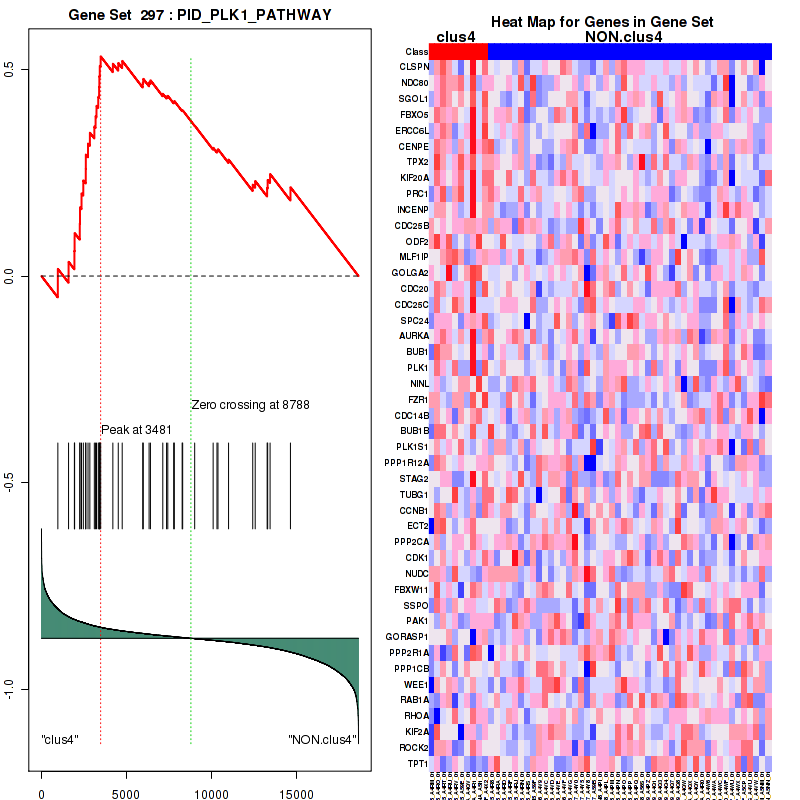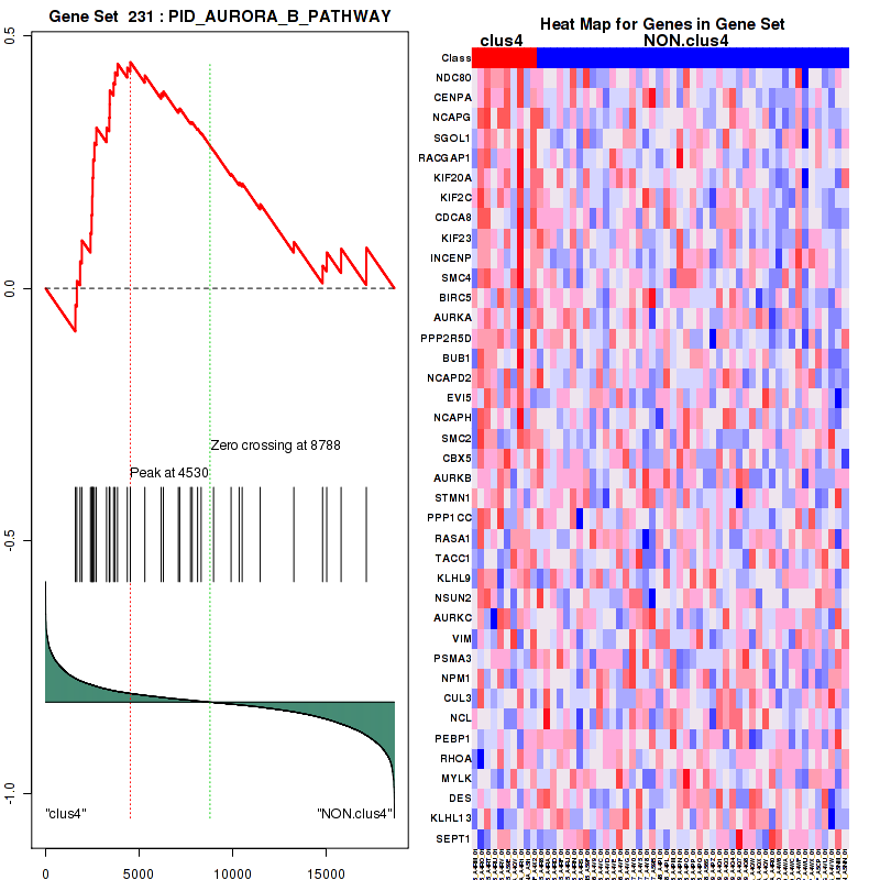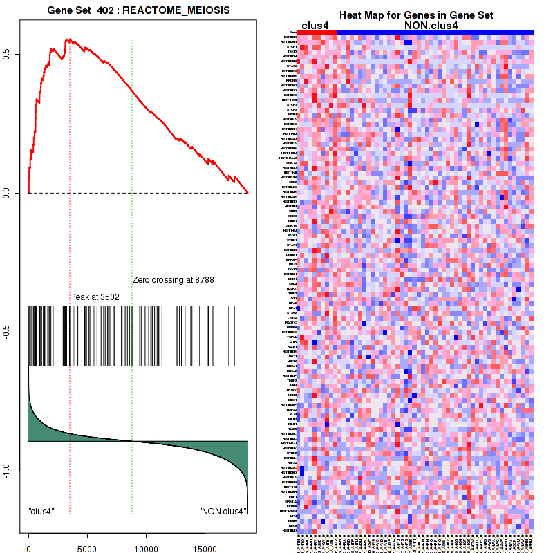 Top enriched gene sets are KEGG CELL CYCLE, ST WNT BETA CATENIN PATHWAY, PID AURORA B PATHWAY, PID PLK1 PATHWAY, PID FOXM1PATHWAY, PID AURORA A PATHWAY, REACTOME MEIOSIS, REACTOME CELL CYCLE, REACTOME SIGNALLING TO ERKS, REACTOME A TETRASACCHARIDE LINKER SEQUENCE IS REQUIRED FOR GAG SYNTHESIS