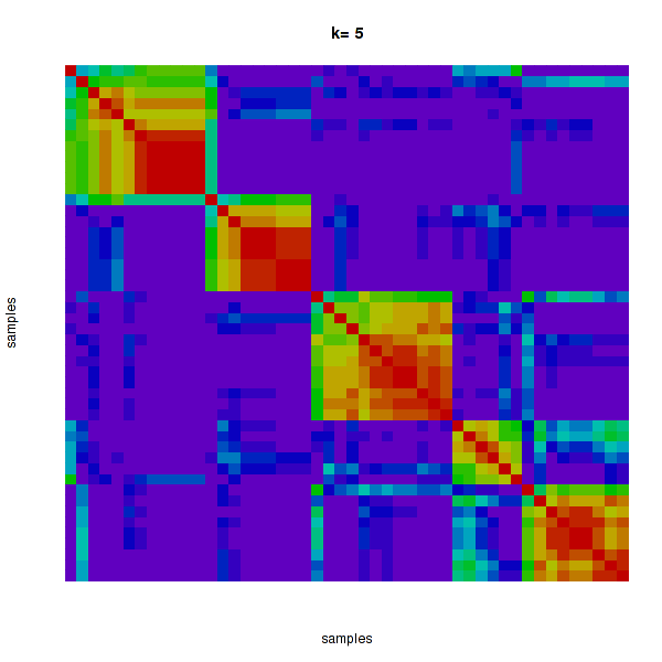 Figure 4. Get High-res Image The consensus matrix after clustering shows 5 clusters with limited overlap between clusters.