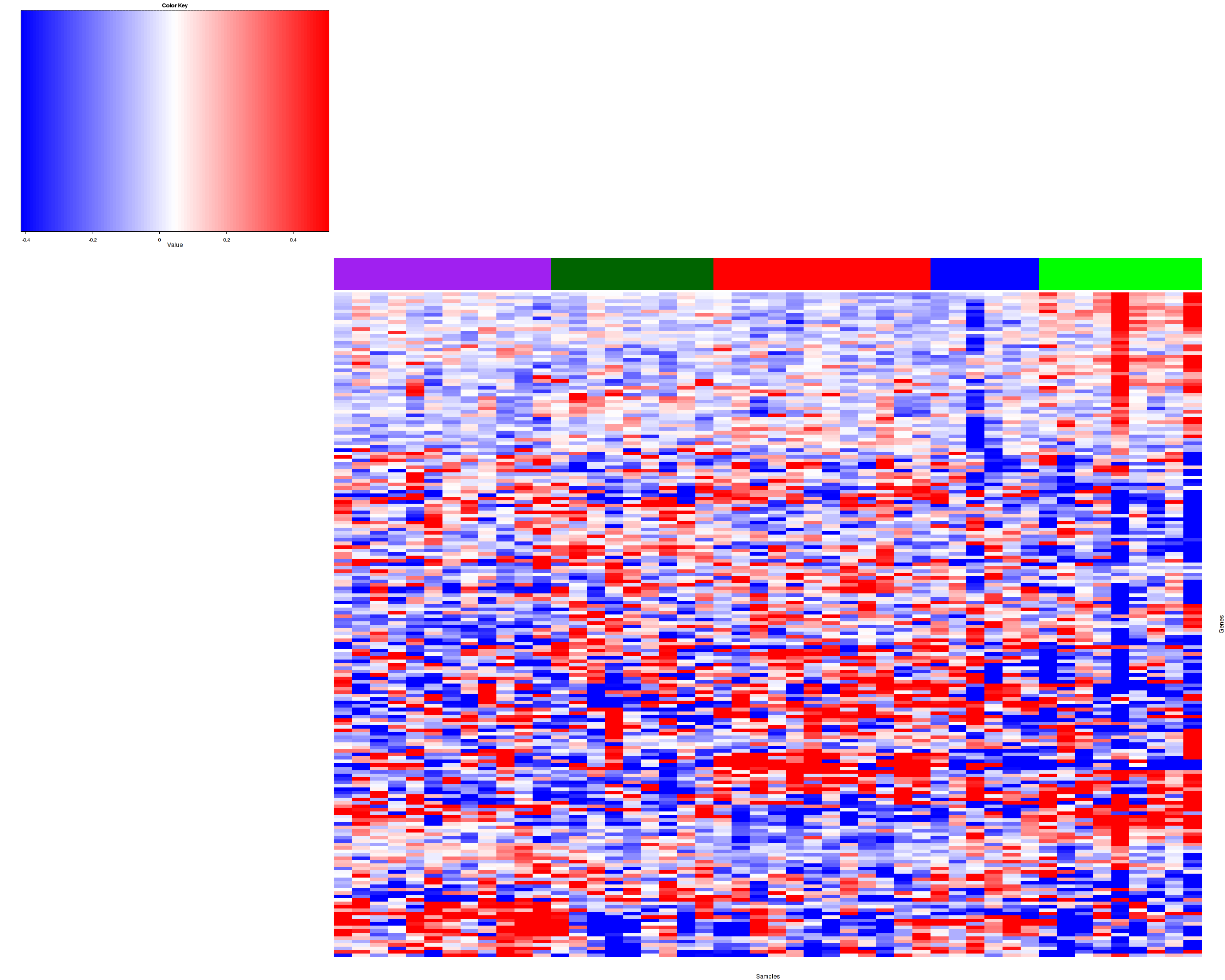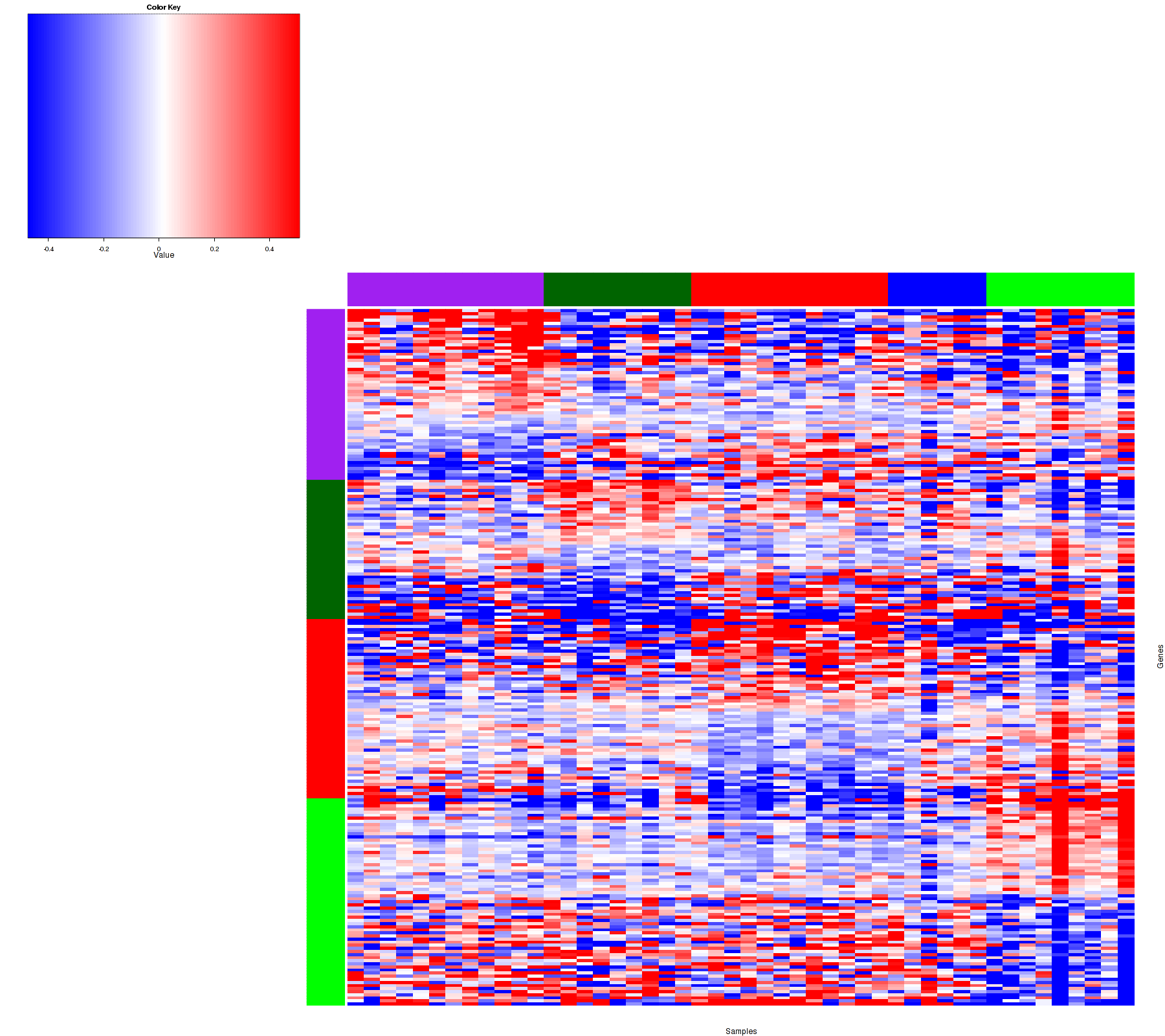 Figure 1. Get High-res Image Samples were separated into 5 clusters. Shown are 48 samples and 225 marker proteins. The color bar of the row indicates the marker proteins for the corresponding cluster.