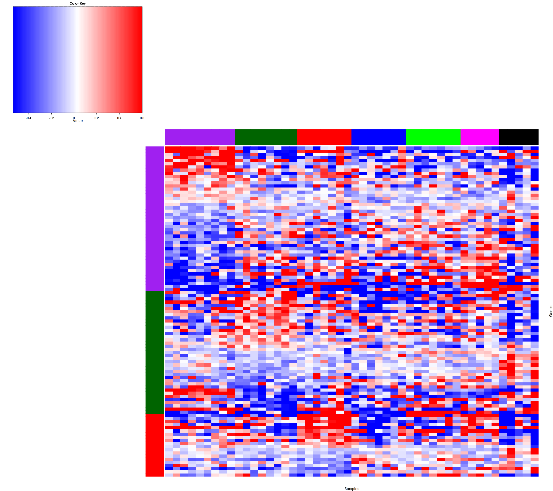 Figure 1. Get High-res Image Samples were separated into 7 clusters. Shown are 48 samples and 105 marker proteins. The color bar of the row indicates the marker proteins for the corresponding cluster.