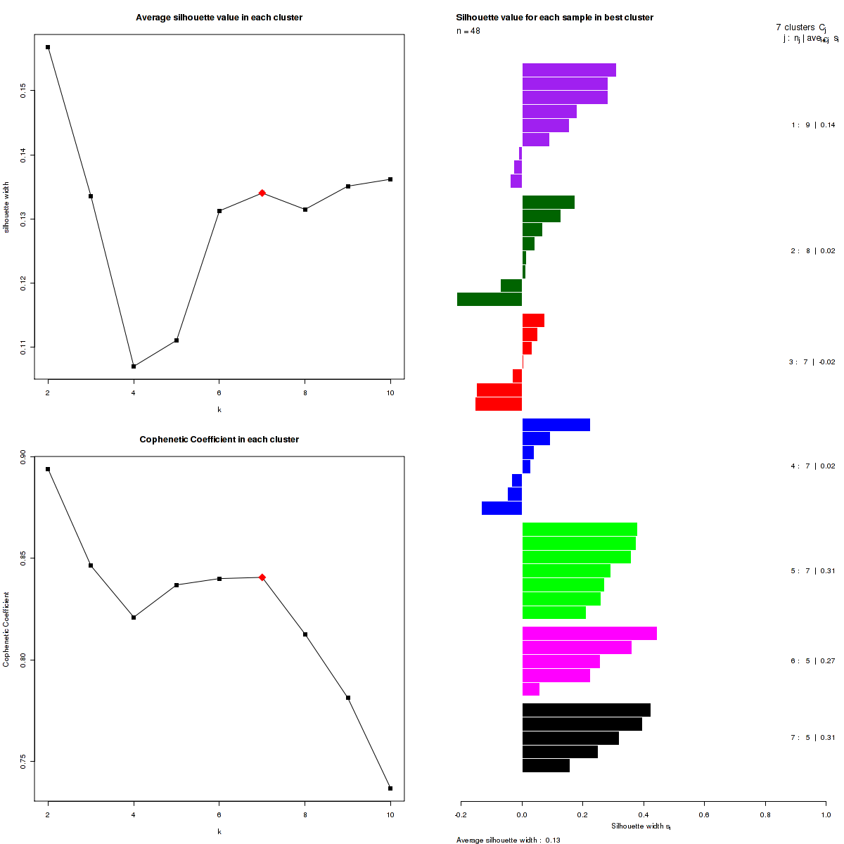 The cophenetic correlation coefficients and average silhouette values are used to determine the k with the most robust clusterings. From the plot of cophenetic correlation versus k, we select modes and the the point preceding the greatest decrease in cophenetic correlation coefficient, and from these choose the k with the highest average silhouette value.