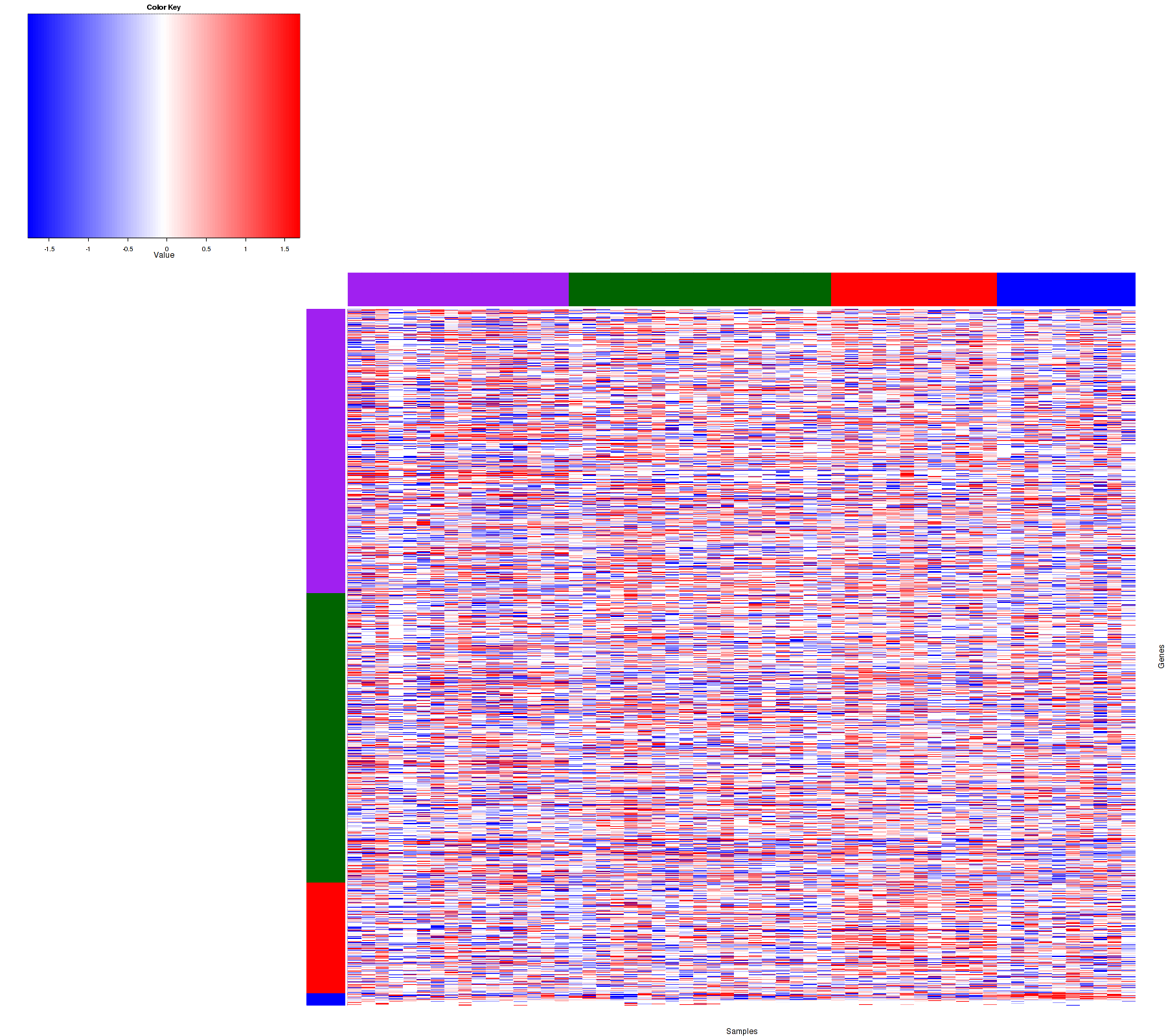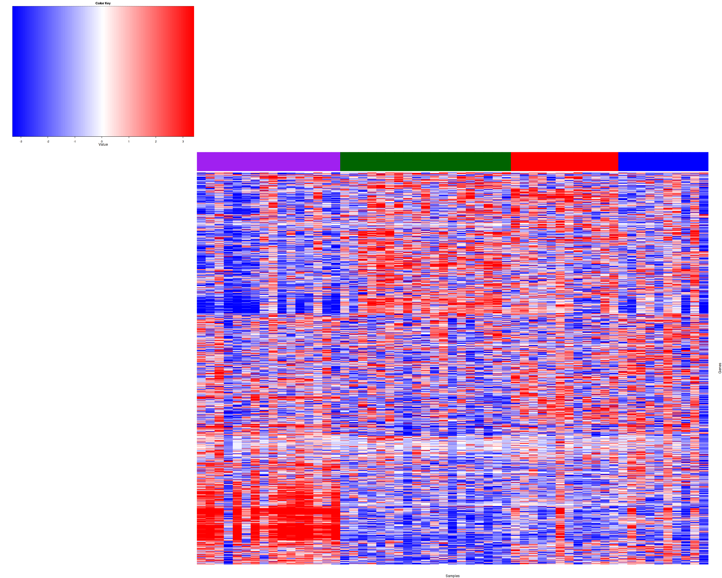 Figure 1. Get High-res Image Samples were separated into 4 clusters. Shown are 57 samples and 10589 marker genes. The color bar of the row indicates the marker genes for the corresponding cluster.