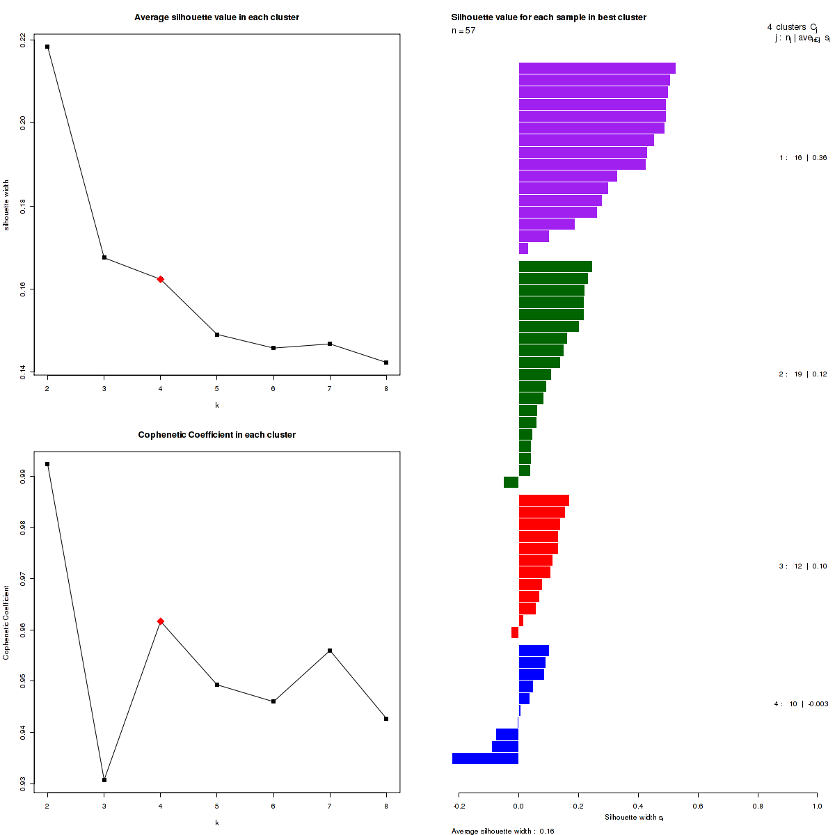 The most robust consensus NMF clustering of 57 samples using the 1500 most variable genes was identified for k = 4 clusters. We computed the clustering for k = 2 to k = 10 and uused the cophenetic correlation coefficient and the average silhouette width calculation to determine the robust clusters.