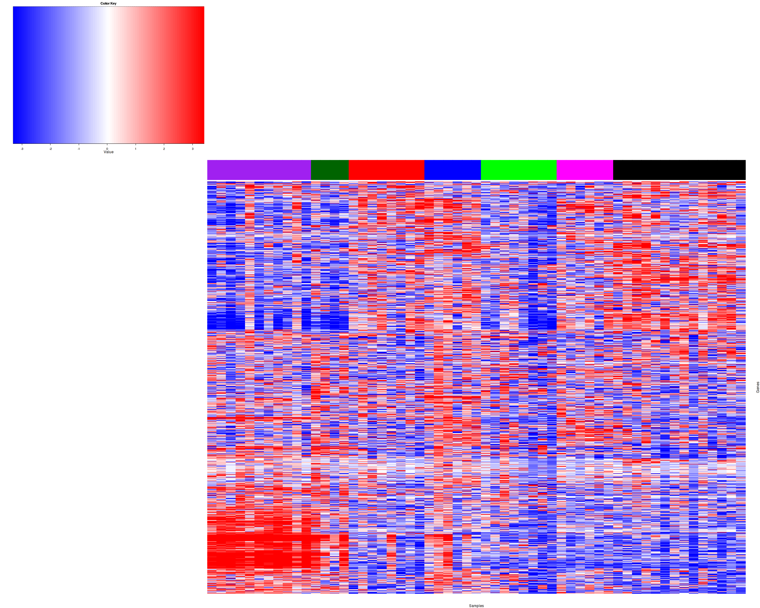 Figure 1. Get High-res Image Samples were separated into 7 clusters. Shown are 57 samples and 1500 marker genes. The color bar of the row indicates the marker genes for the corresponding cluster.